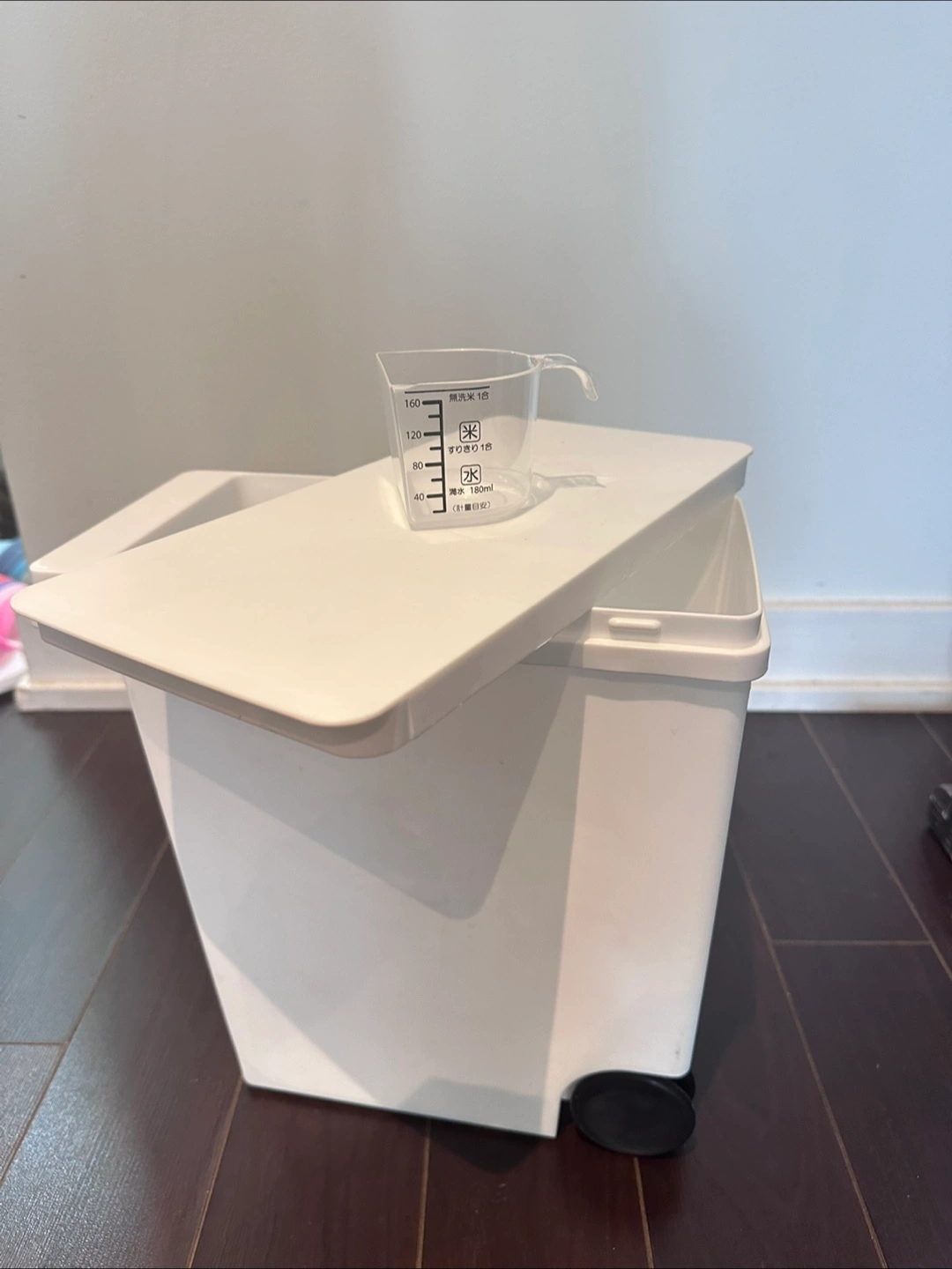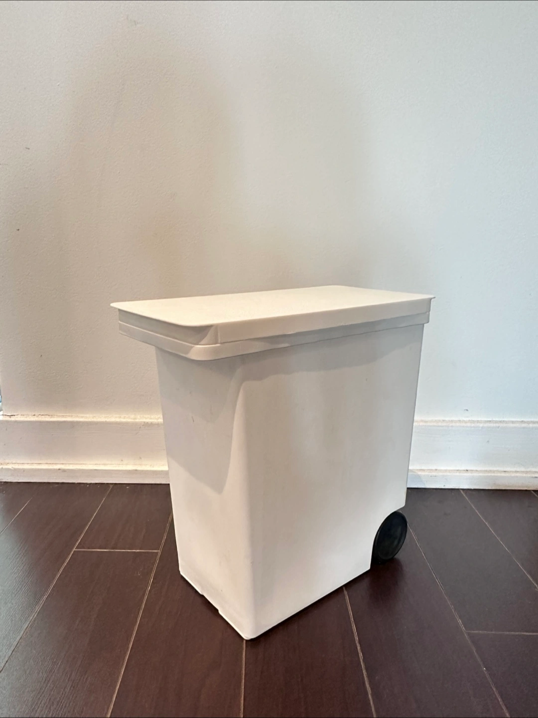Large white plastic rice storage container. Features a removable lid and two small wheels