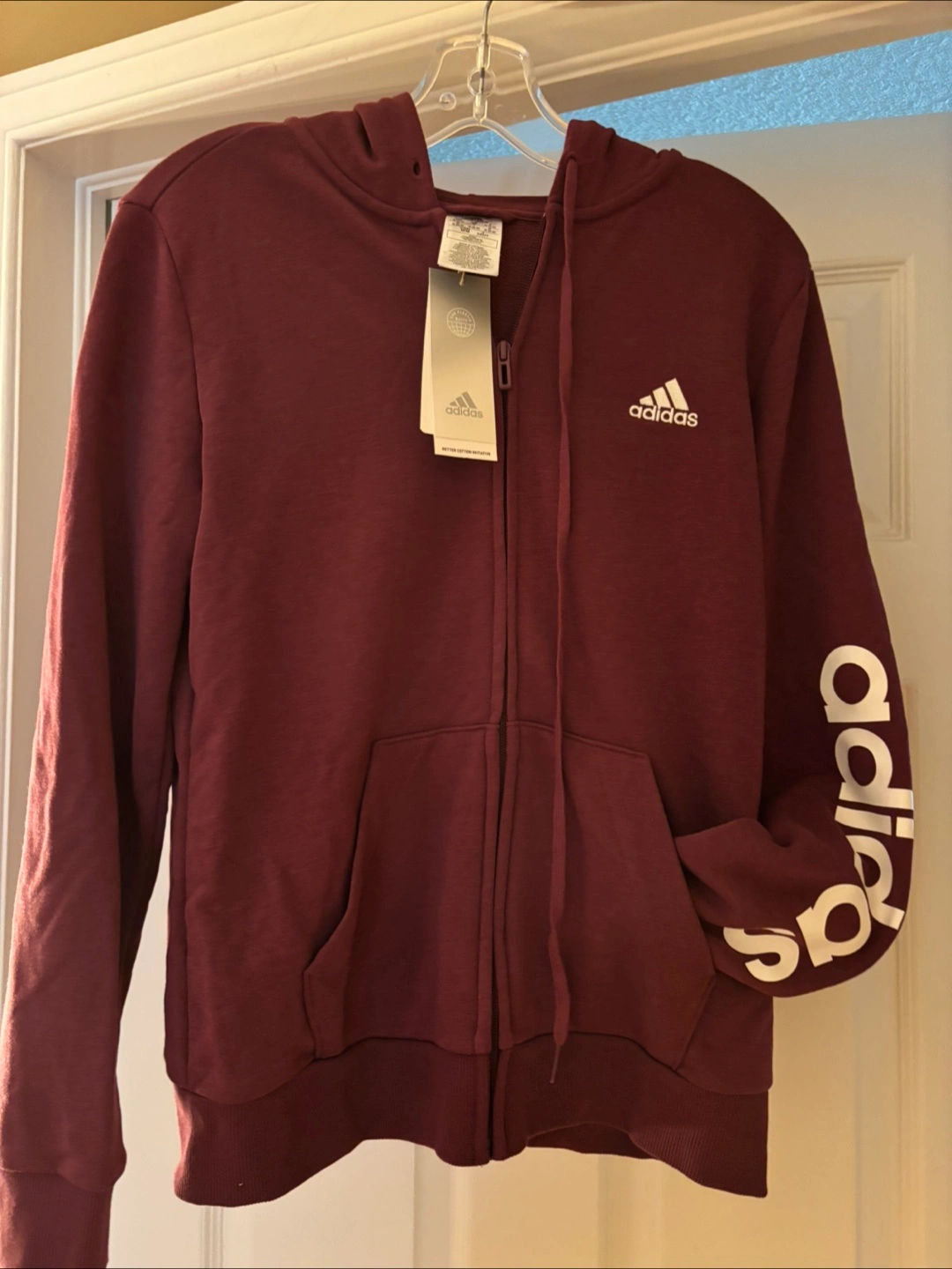 Women's Adidas zip-up hoodie. Maroon colour. Features Adidas logo on the chest and sleeve. New with tags. Soft comfortable fabric. Perfect for layering or everyday wear.