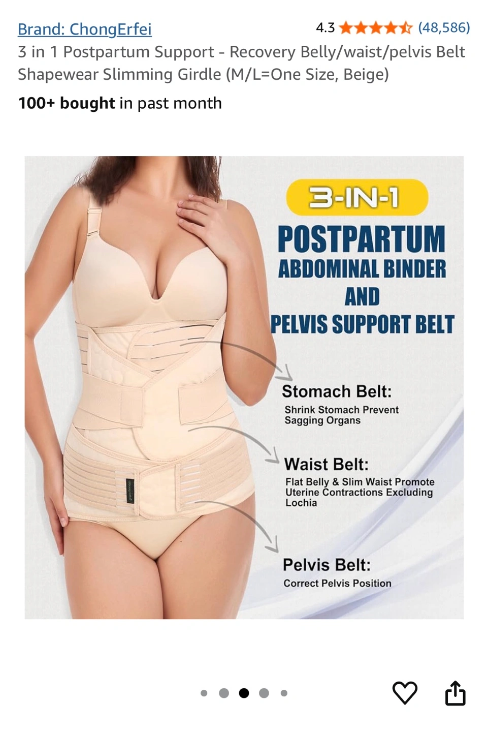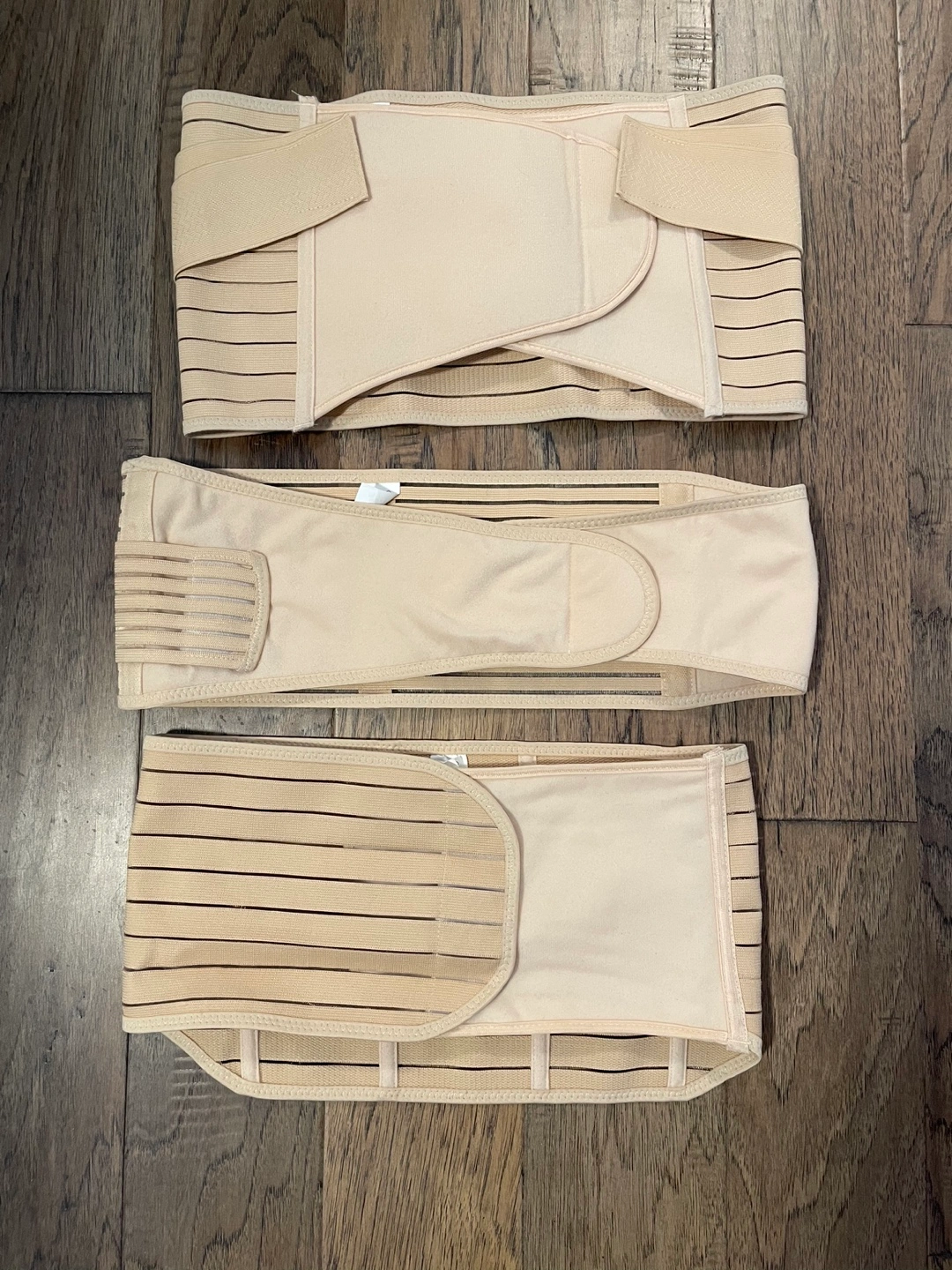 Three beige postpartum support belts. One size fits most. Includes stomach, waist, and pelvis support. Shrink stomach, prevent sagging organs. Flat belly and slim waist. Promote uterine contractions. Correct pelvis position.