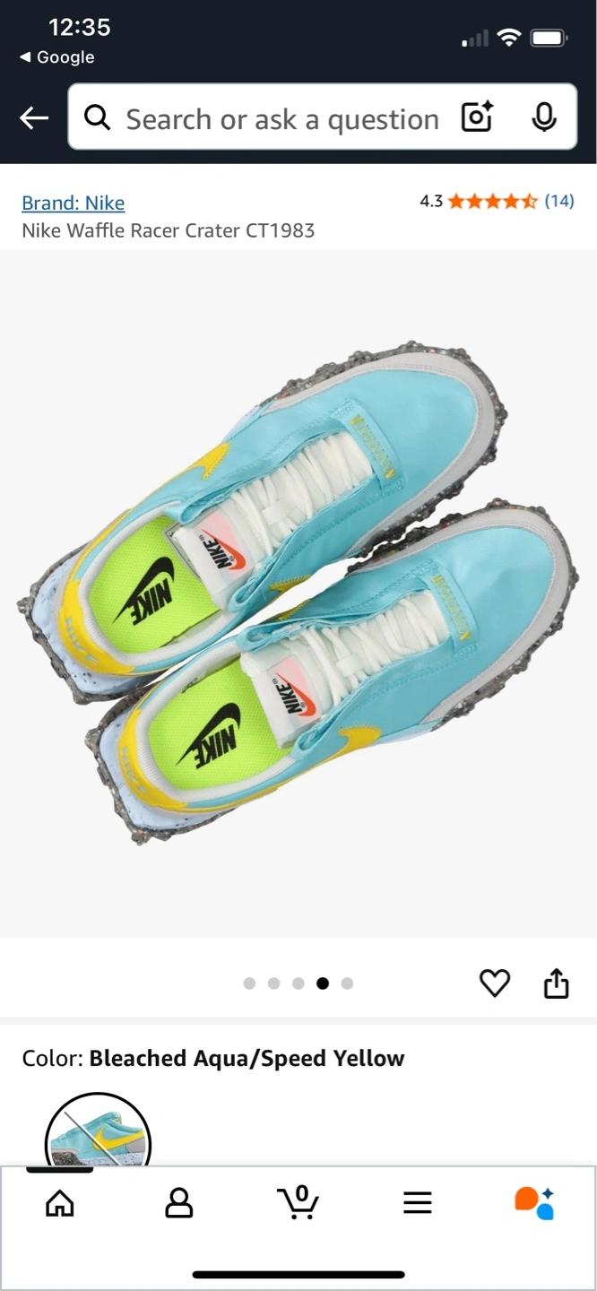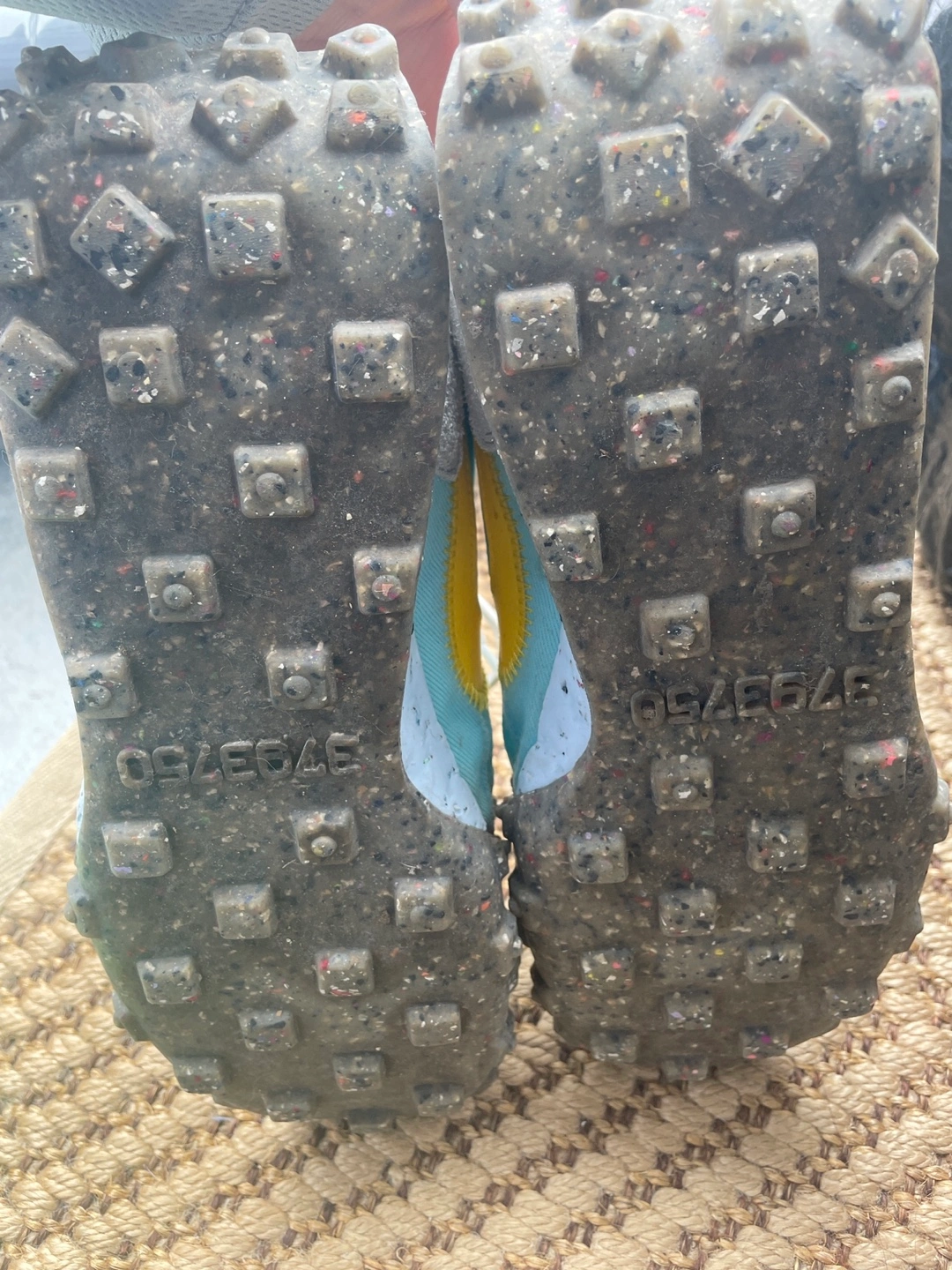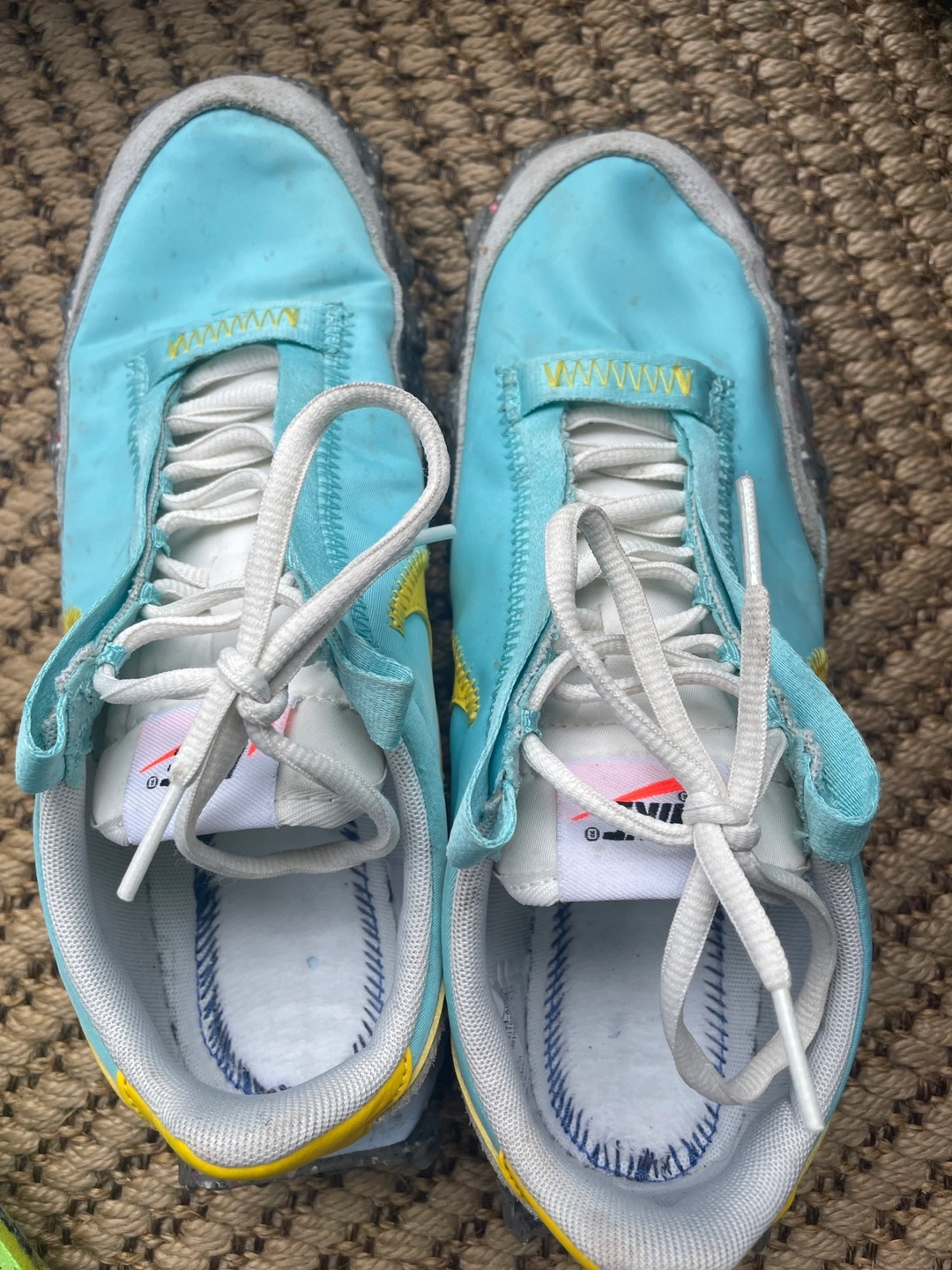 Pre-owned Nike Waffle Racer Crater sneakers. Bleached Aqua and Speed Yellow colourway. Used condition, shows wear.