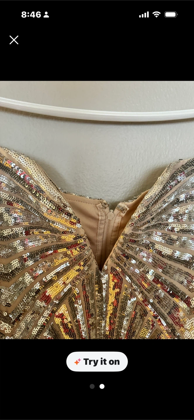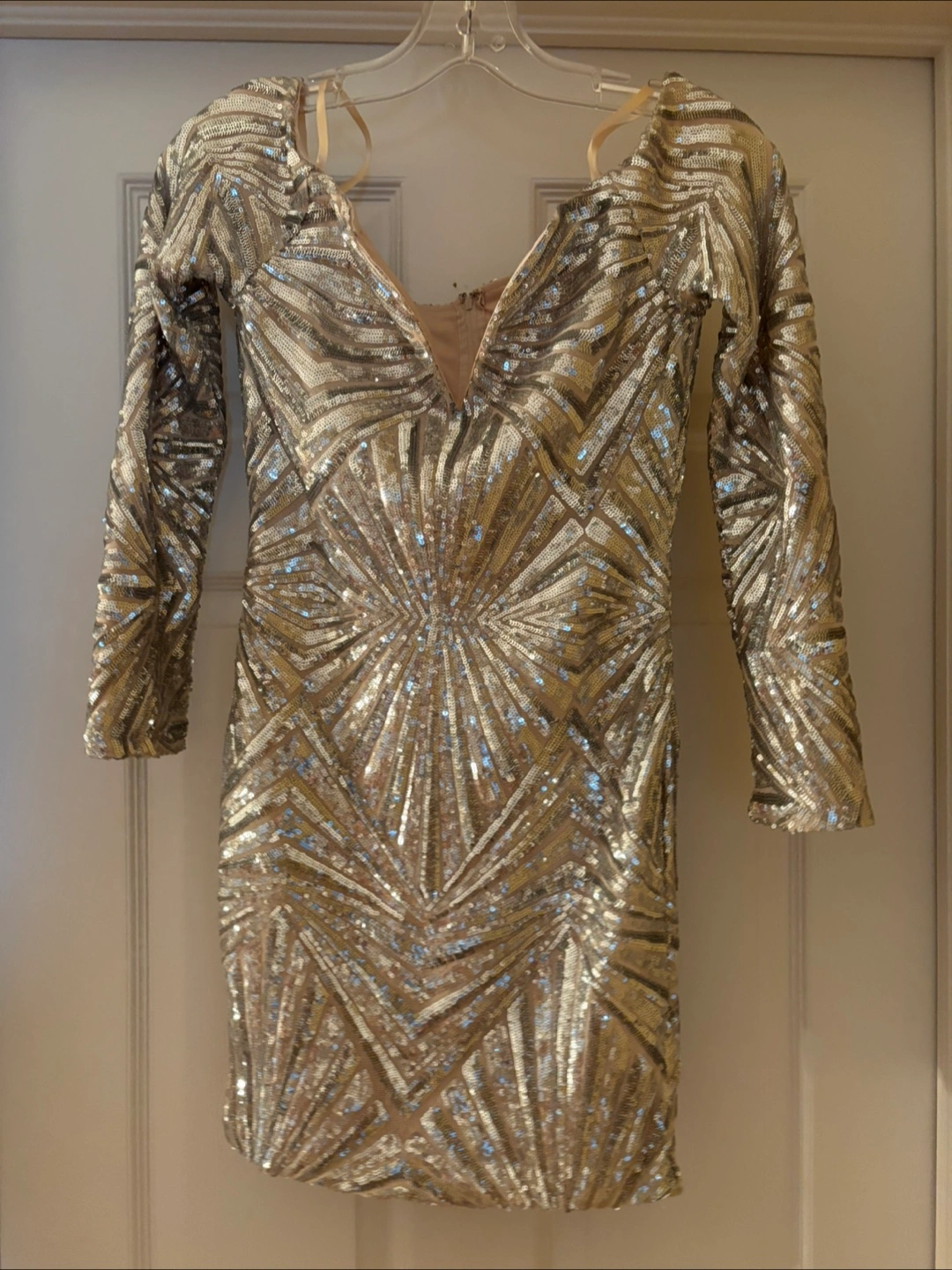 Gorgeous champagne-coloured mini dress. Long sleeves. Sequin detail. Back zipper. Perfect for a special occasion.