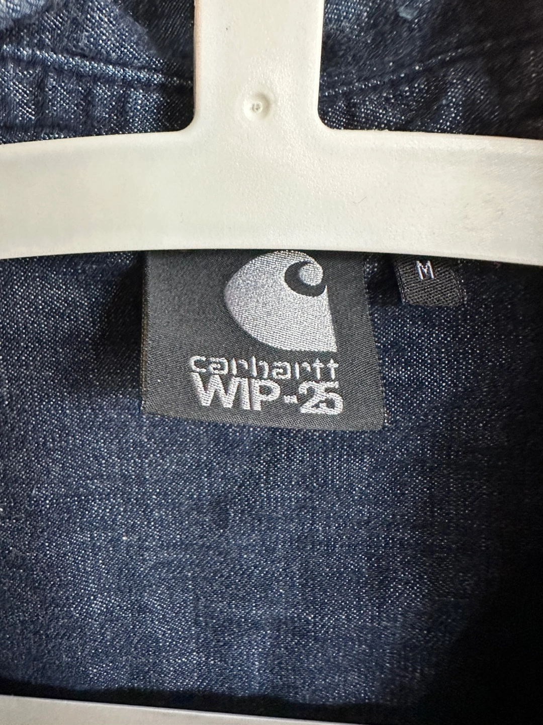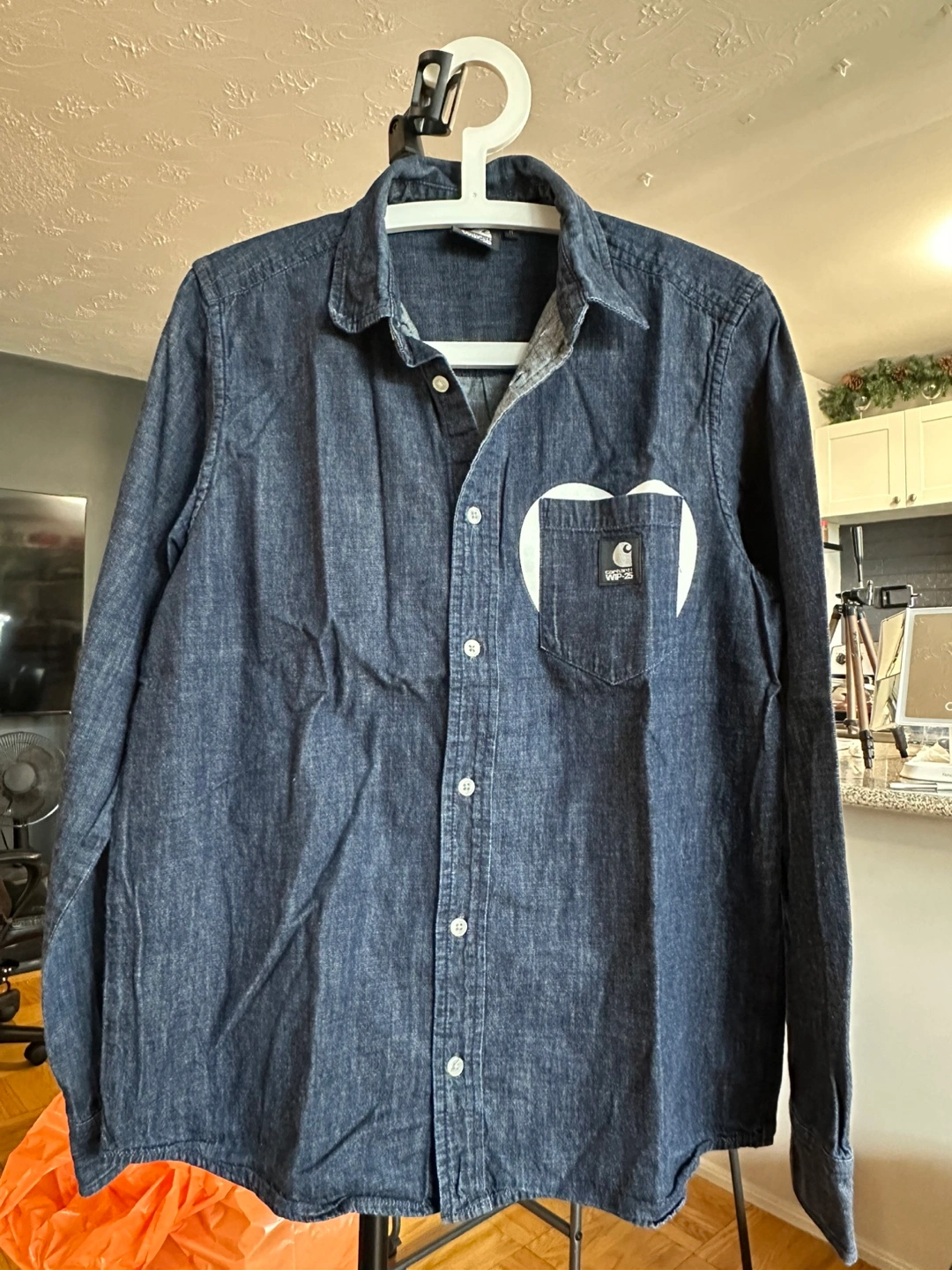Men's Carhartt WIP long sleeve denim shirt. Size medium. Features a unique heart-shaped pocket with logo. Button-down closure. Excellent for casual wear.