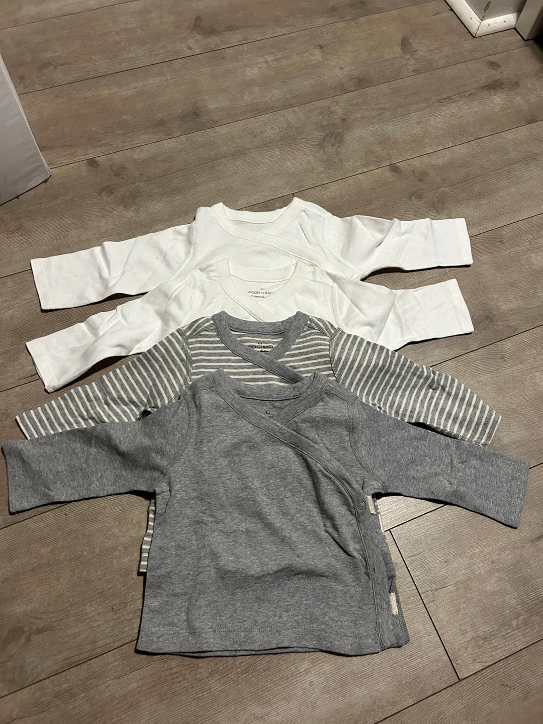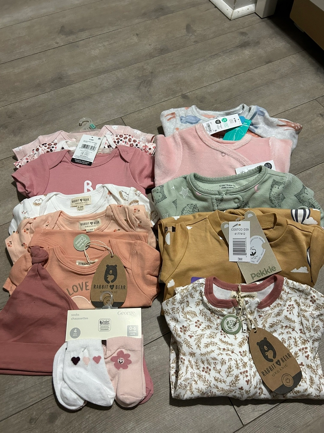 Large bundle of baby clothes, including bodysuits, sleepsuits, and a hat and socks set. Various colours and patterns. Sizes newborn to 3 months.