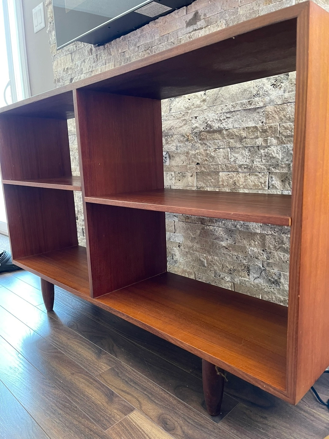 Add a touch of mid-century modern charm to your home with this stylish bookshelf! This versatile piece features a four-cube design, perfect for displaying books, records, or decorative items. The warm wood finish and tapered legs give it a classic look that complements any decor. This piece shows signs of wear consistent with age.