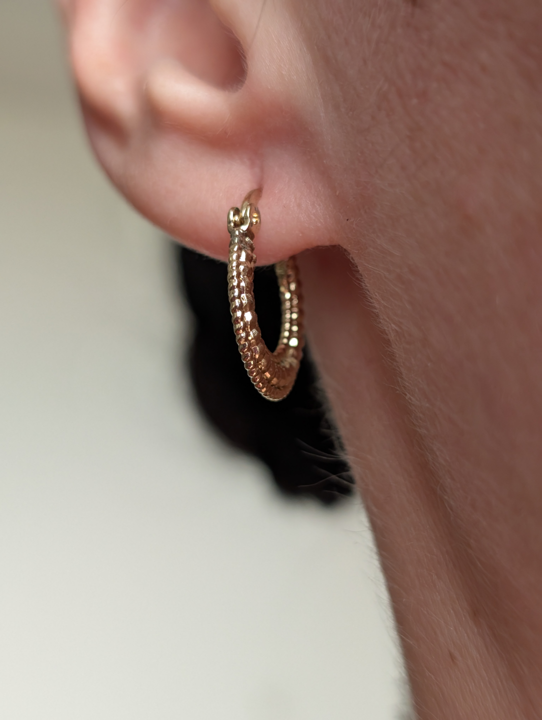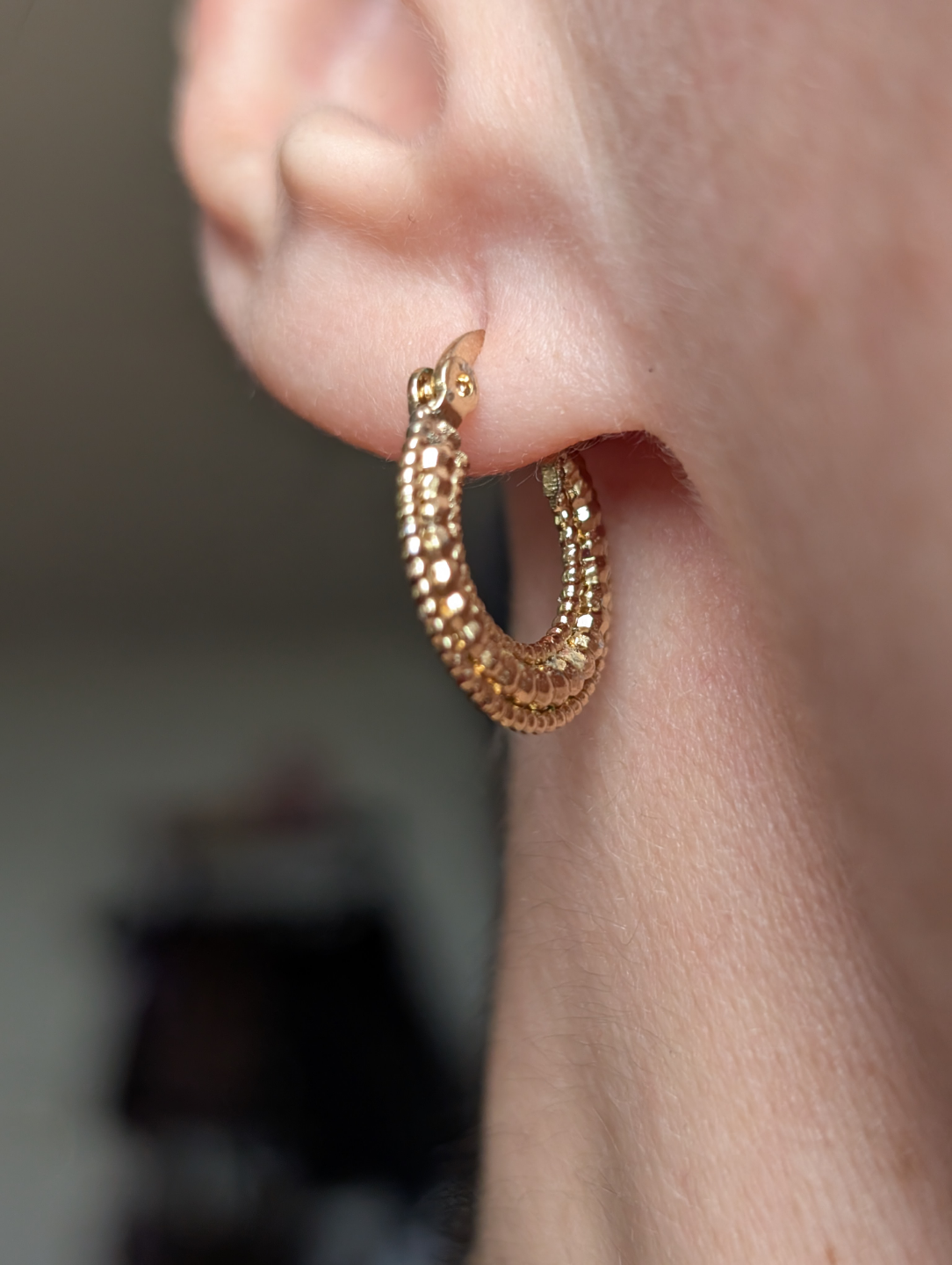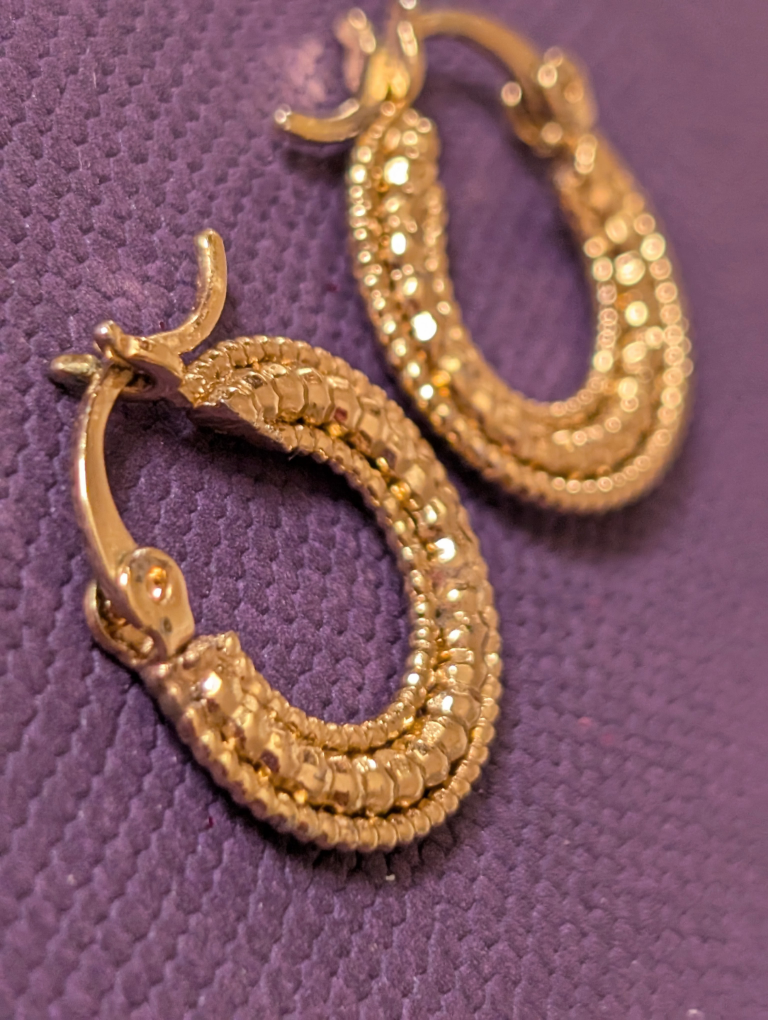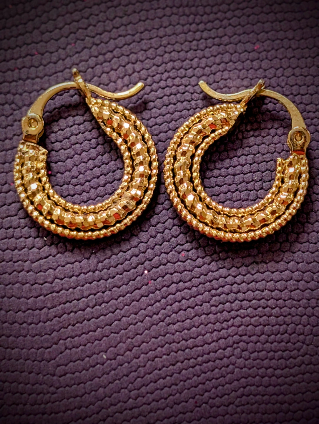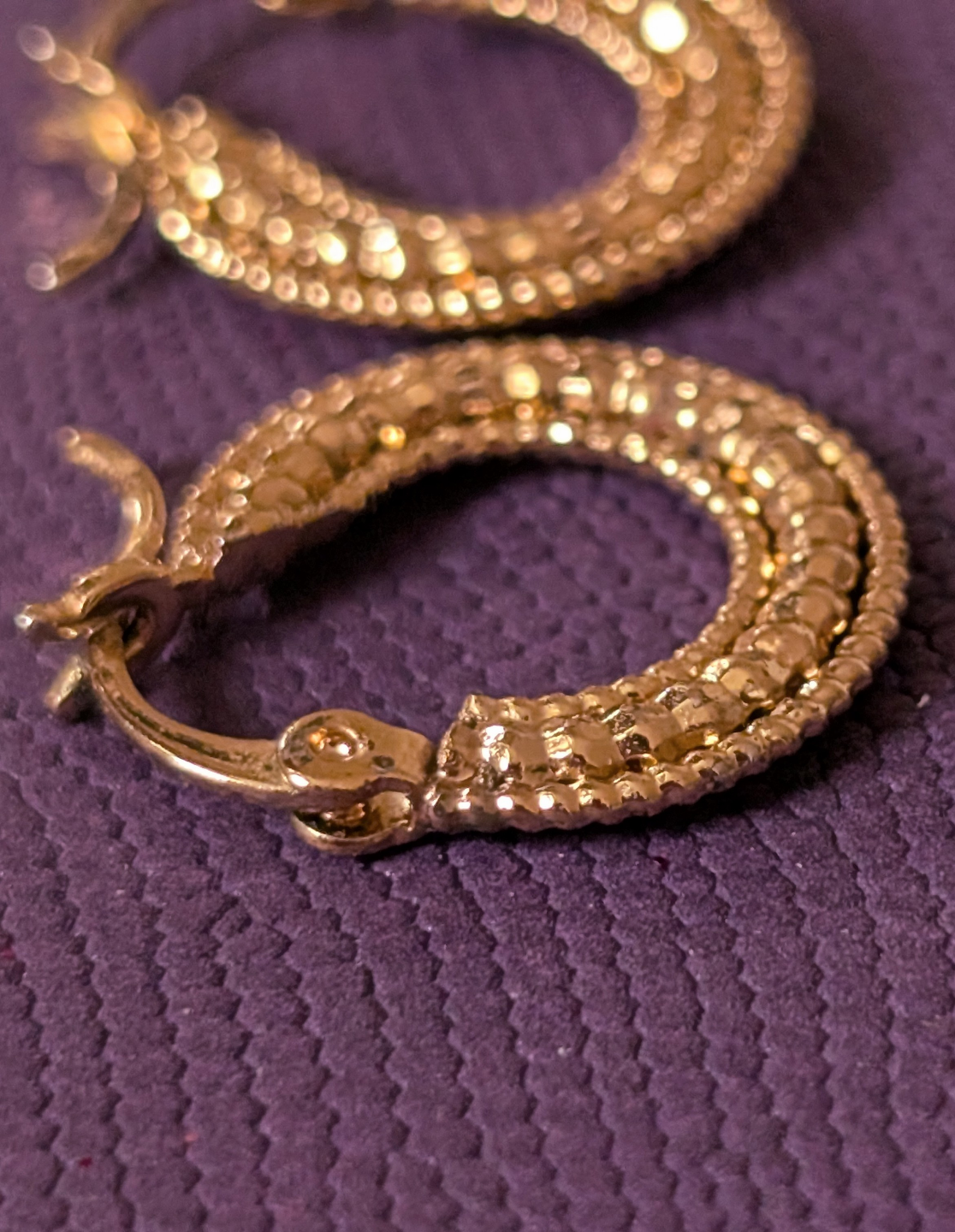 💛Beautiful gold tone textured hoop earrings. Small, lightweight, and perfect for everyday wear. Hinge closure.
