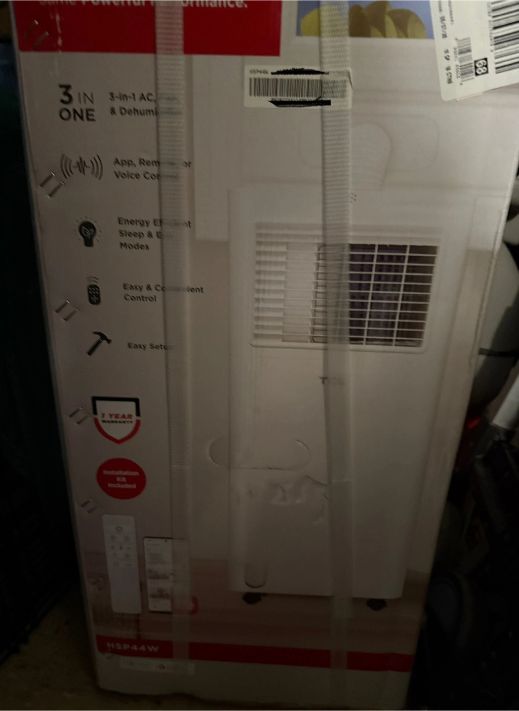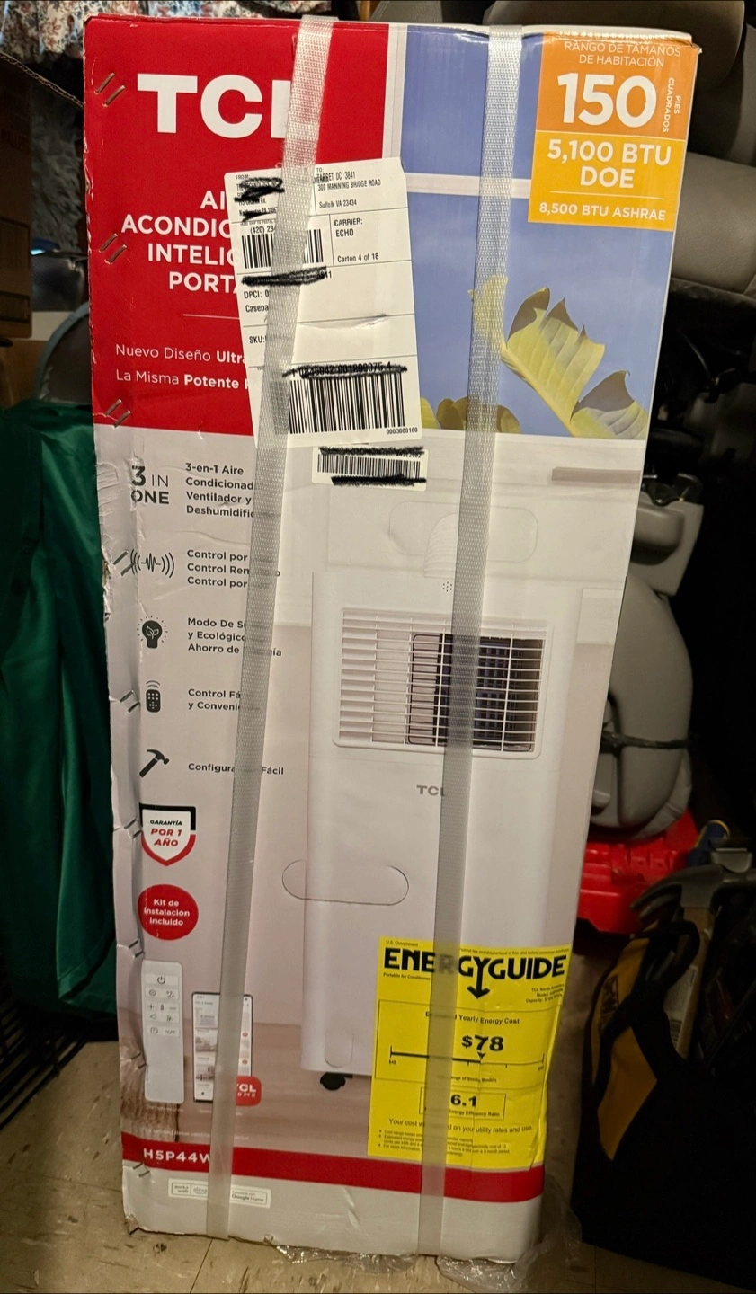 Smart portable air conditioner, fan, and dehumidifier. Includes remote and app control. Energy efficient. Easy setup. White.