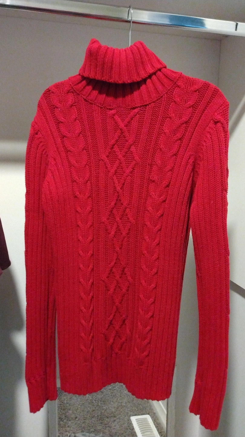 Long-sleeved, red turtleneck sweater. Features a cable knit pattern. Cozy and warm. Perfect for fall or winter.