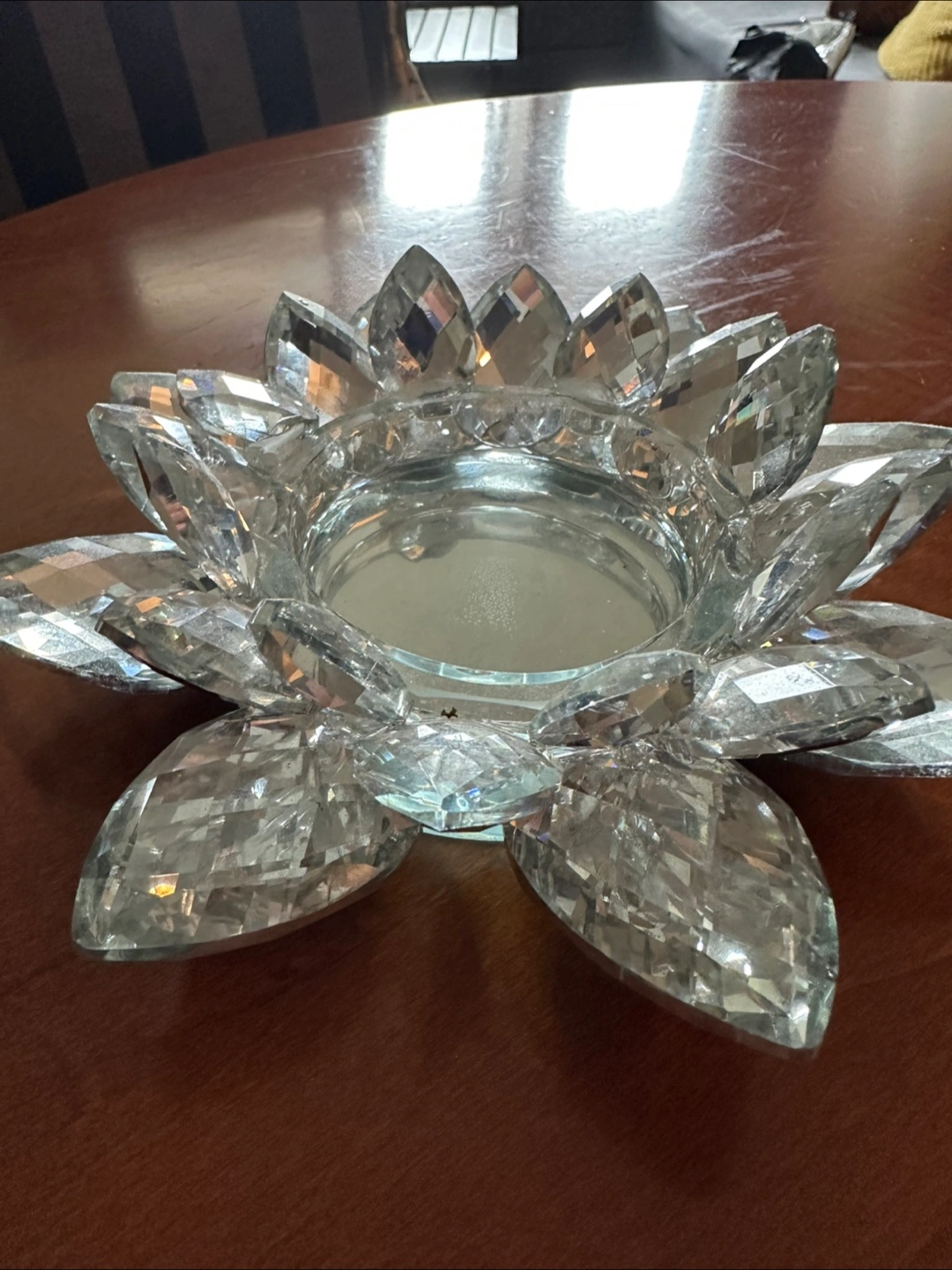 84Beautiful crystal lotus flower candle holder. Elegant design. Perfect centerpiece or decorative accent. Adds sparkle to any room.