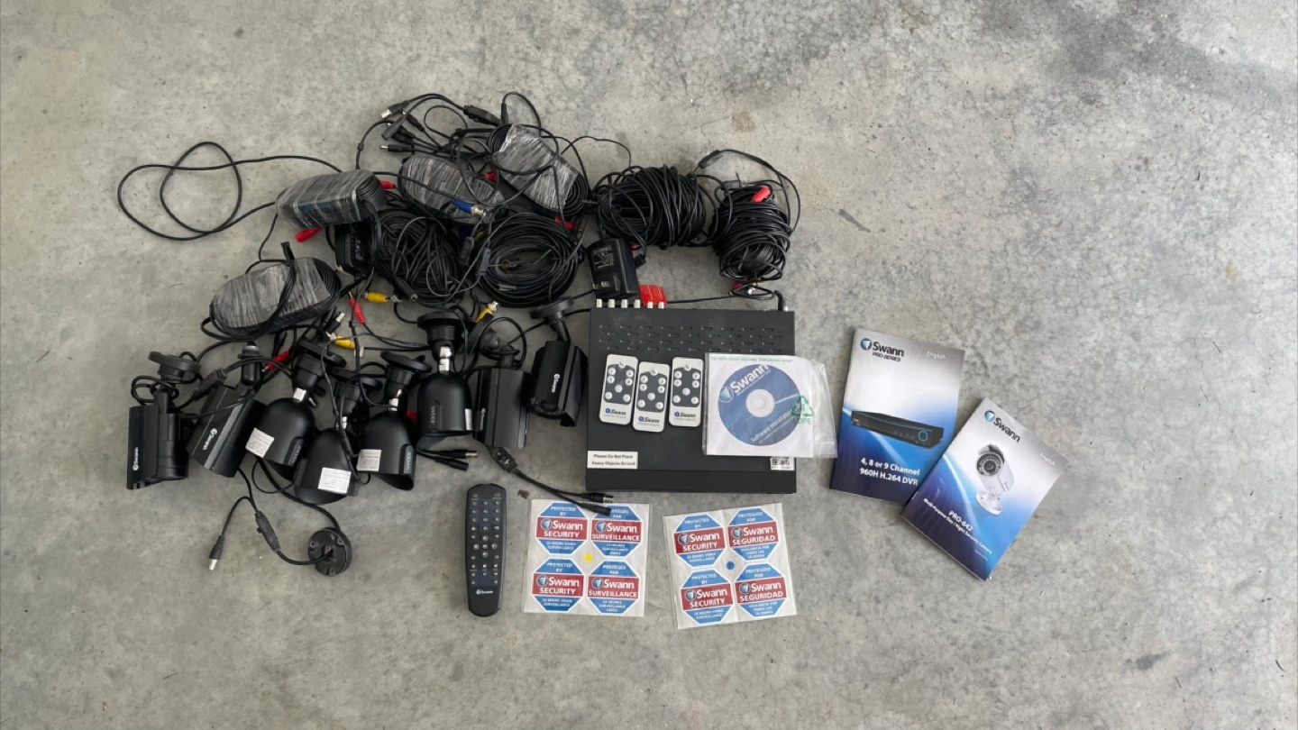 Complete security camera system. Includes DVR, cameras, cables, remotes, and manuals. Pre-owned, some wear.