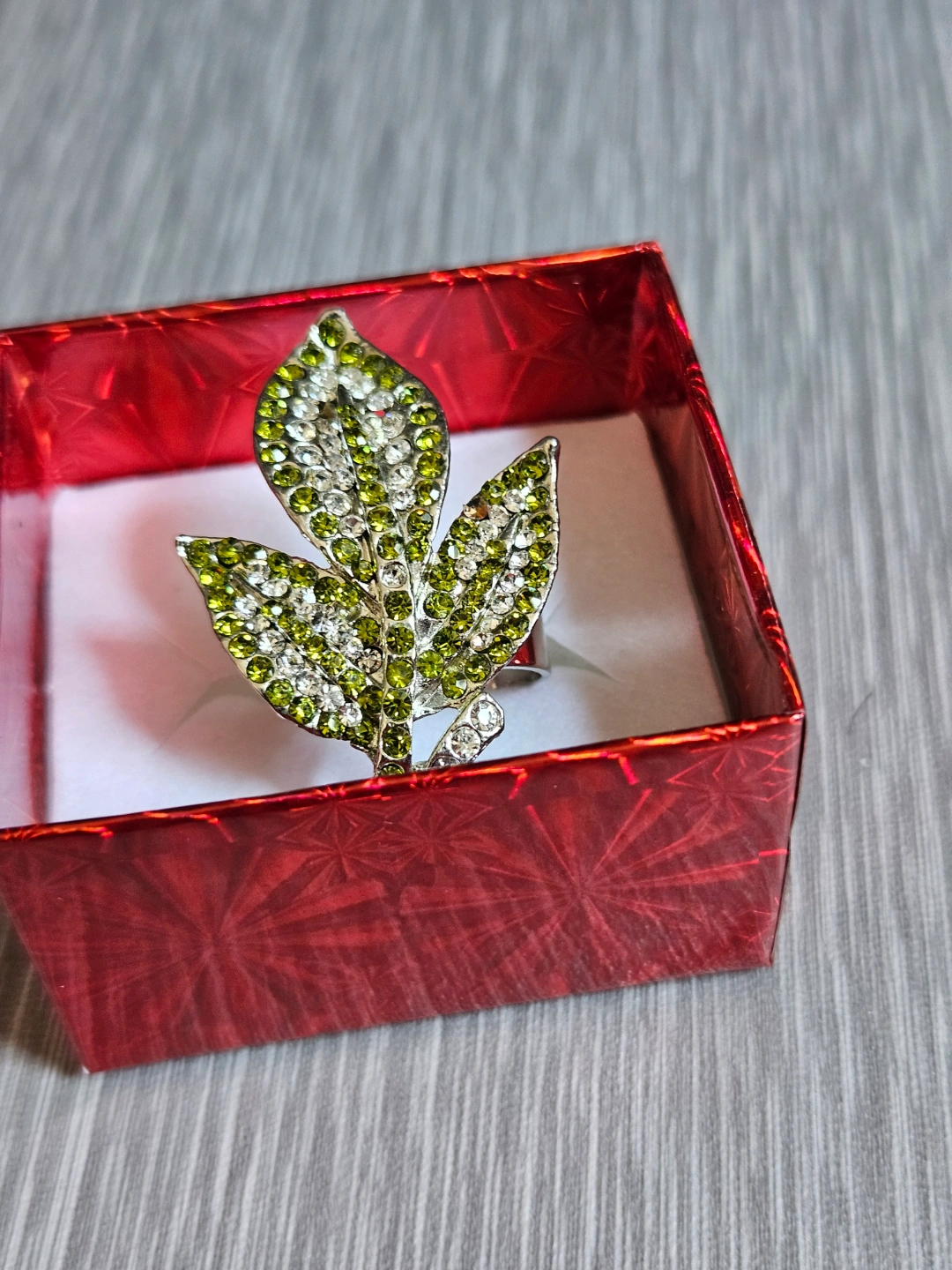 Beautiful ring. Silver tone metal. Green and clear rhinestones. Leaf design. Comes in a red gift box.