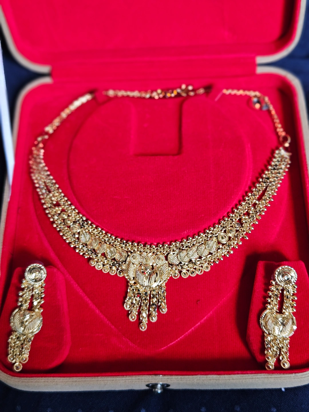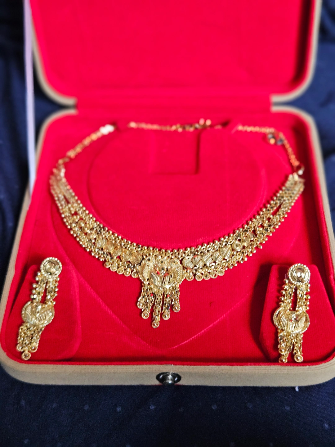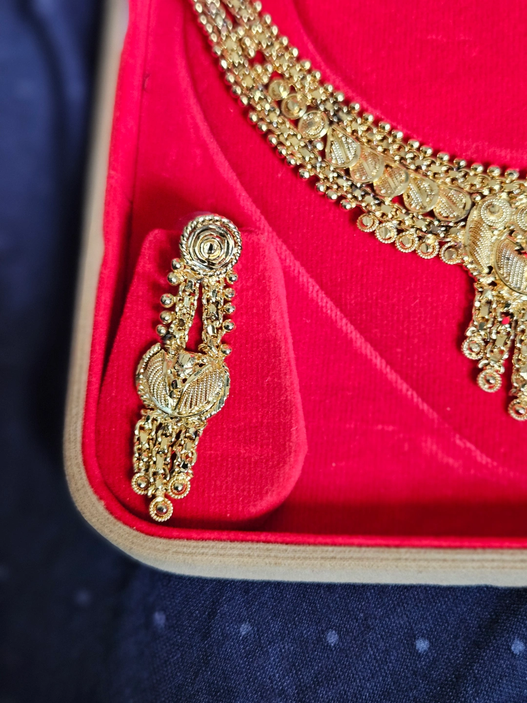 Beautiful gold necklace and earrings set. Intricate design. Comes in a box. Perfect for special occasions.