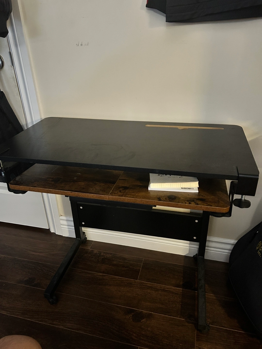 Adjustable height standing desk converter. Two-tier design. Black frame and wood-look top. Great for home or office.