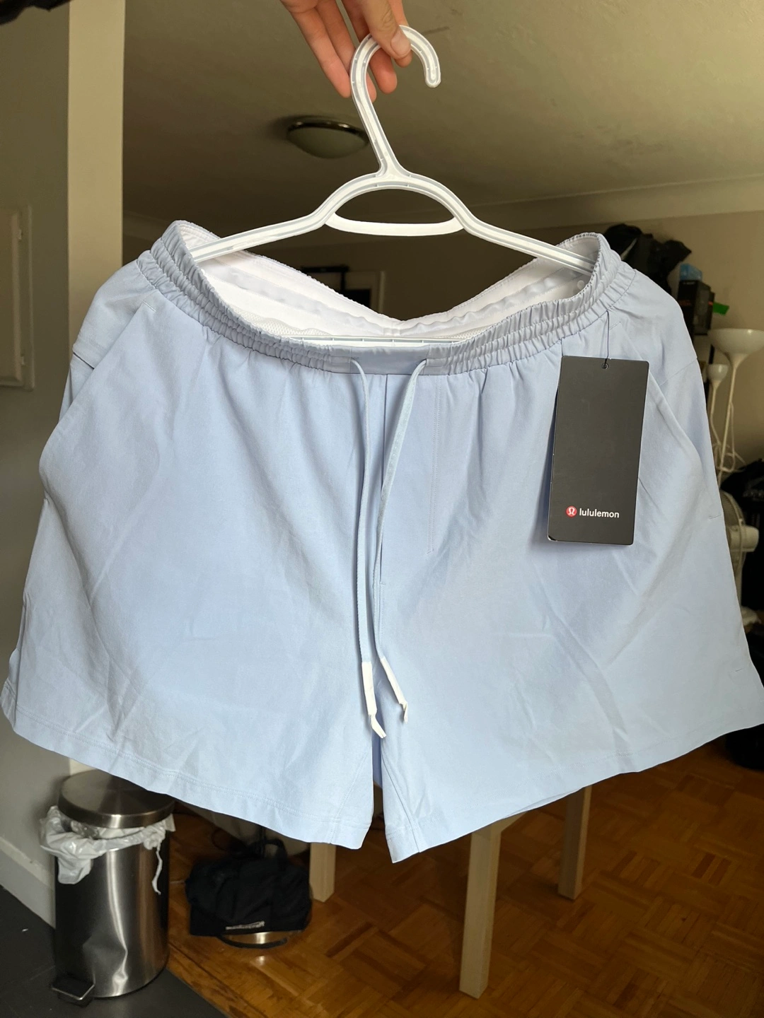 Lululemon Pool Short 5" in size medium. Light blue colour. Water-repellent and breathable fabric. Features a zippered pocket and drawstring. Excellent for the pool or any activity.
