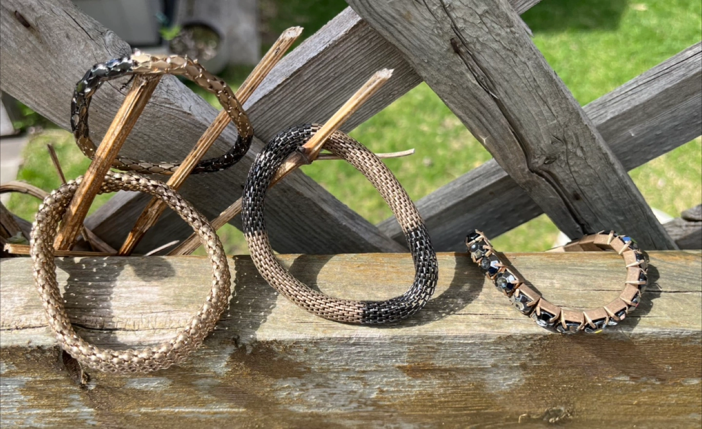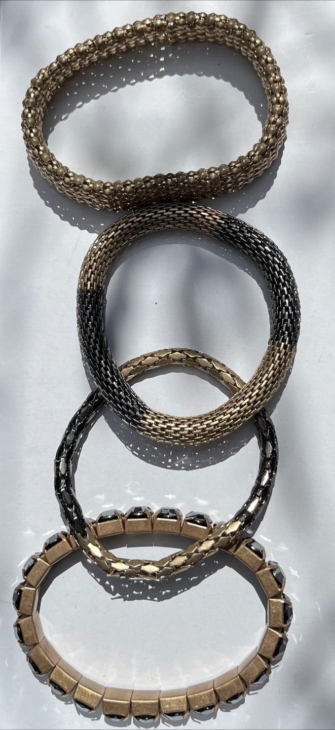 Four stretchy bracelets. Two gold tone, one black and gold tone, one with dark grey crystals. Great for layering.