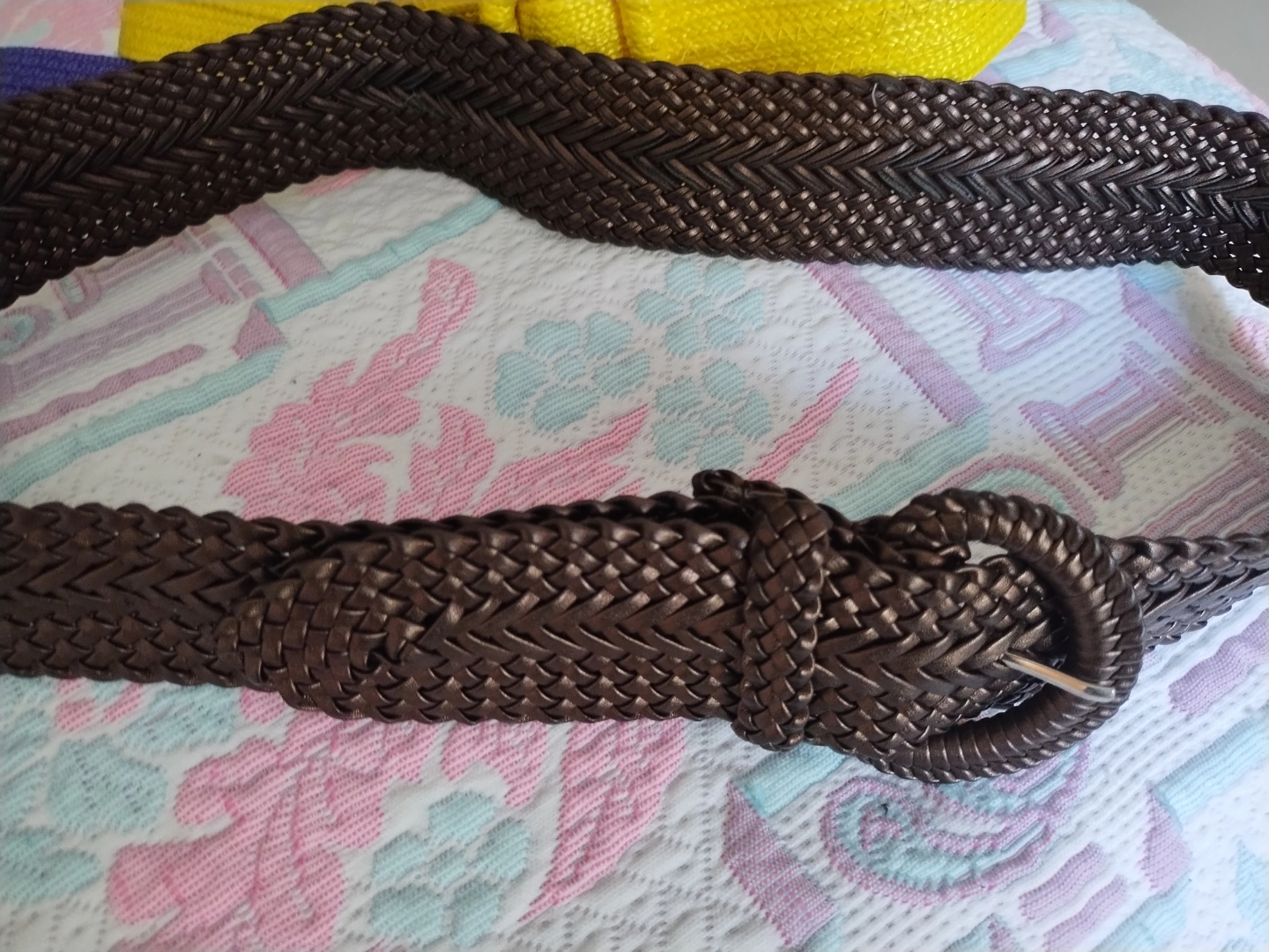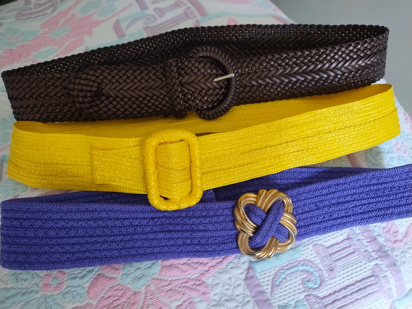Three stylish belts. One purple with gold clasp, Velcro fasteners, one yellow with simple buckle, one brown braided with a ring buckle. Good condition. Perfect for adding a pop of colour to your outfits.