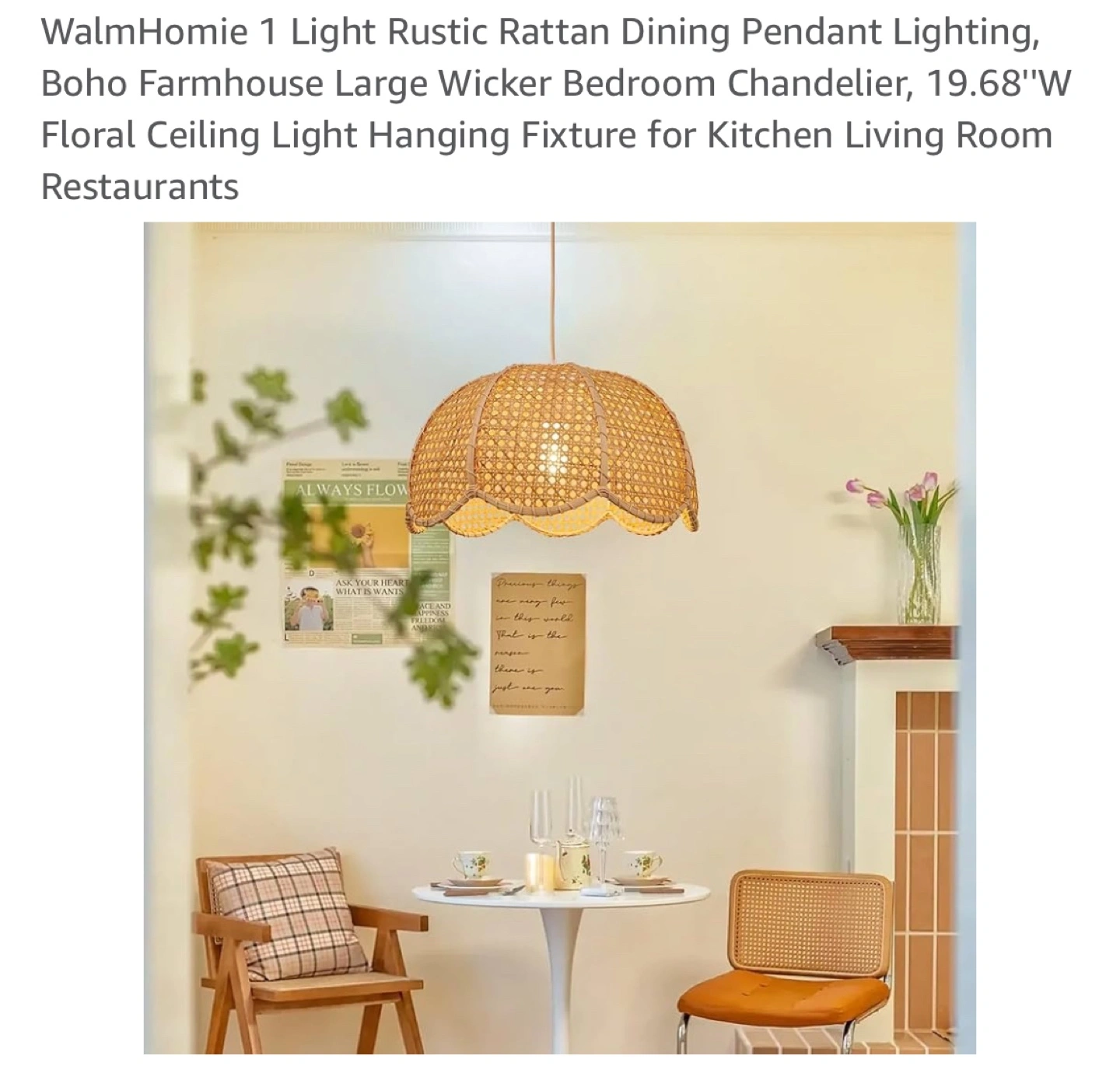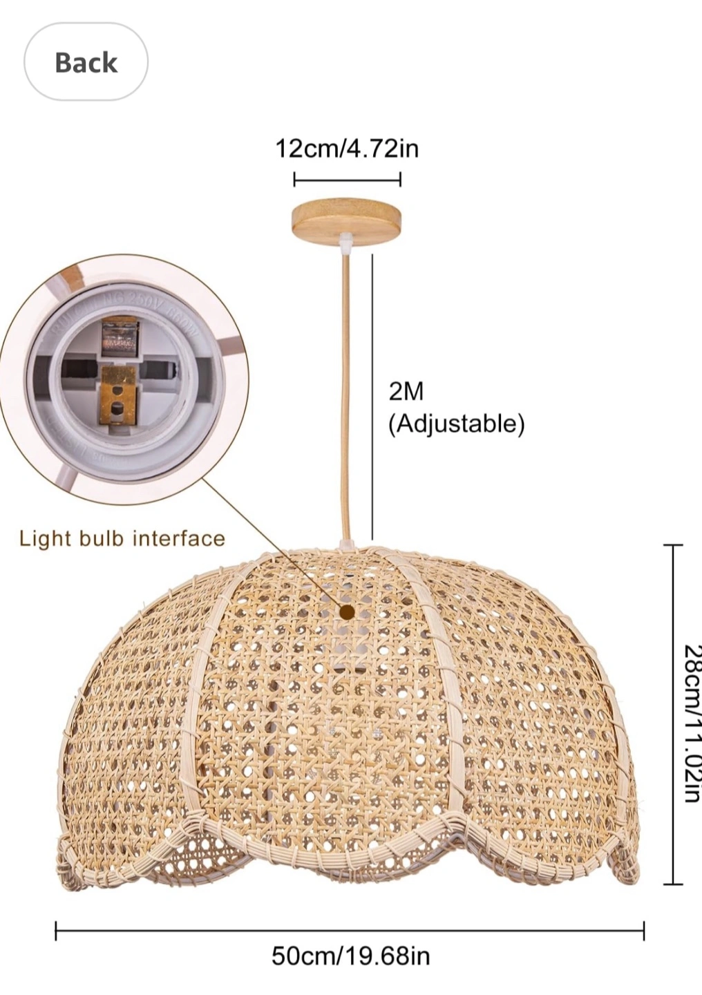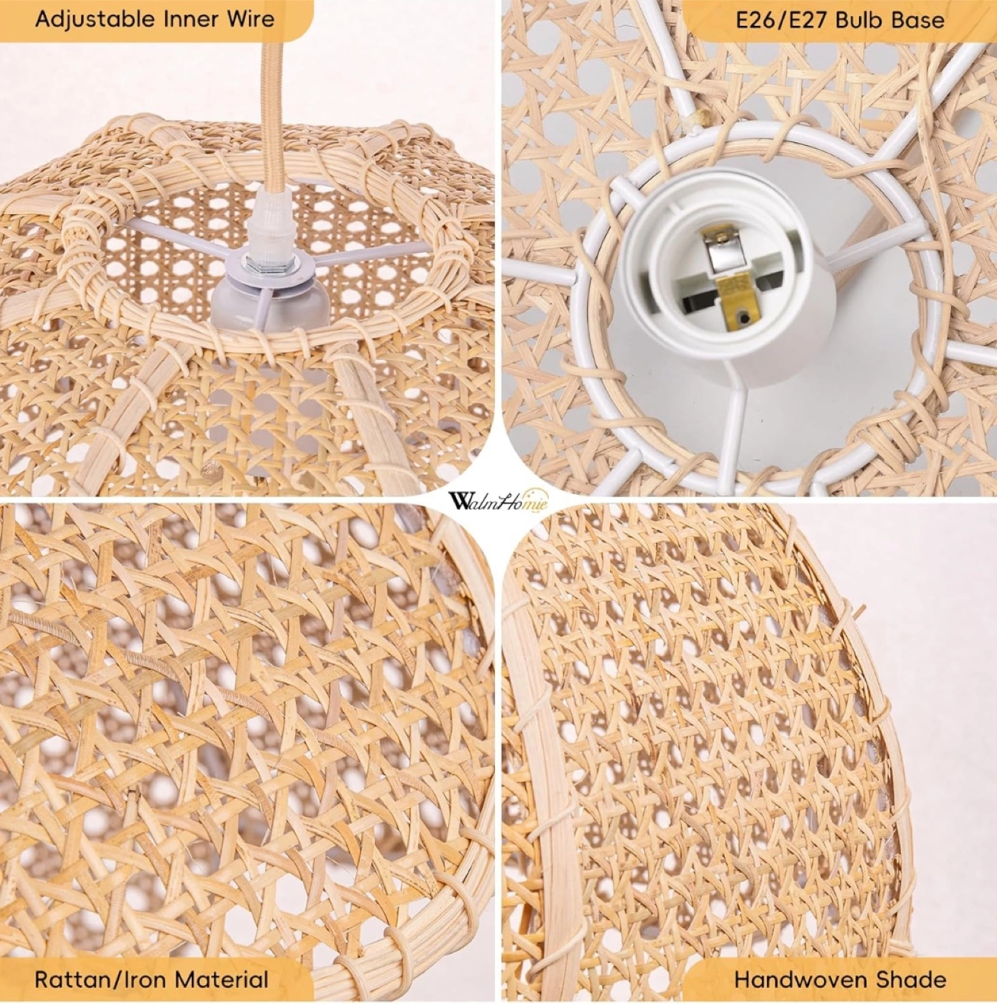Brand WalmHomie Colour Natural Material Rattan, Iron Style Country Rustic Light fixture form Pendant Room type Entryway, Kitchen, Bedroom, Living Room, Dining Room 💡[Natural Material]: this floral chandelier is made from rattan, beautiful farmhouse wicker light fixture, elegant and chic lampshade. 💡[Various Places]: our rustic large pendant light is a great home decor for farmhouse, living rooms, dining rooms, bedrooms, restaurants, kitchens, laundry rooms, hallways, cafes, basements, stairwells, libraries, office and more. 💡[Care and Maintenance Methods]: please wring the wet cloth or using a soft cloth to wipe the dust gently. Please note that this hanging lighting is handwoven, so the size may have an error of about 1~2 centimeters. 💡[Easy to Install]: E26/E27 bulb base, 60W(Max), 110~130V, hardwired. NOT BULB INCLUDED, package includes lampshade and all mounting hardware accessories.