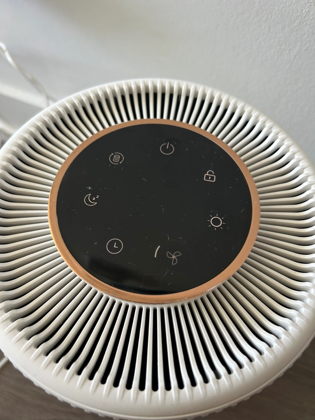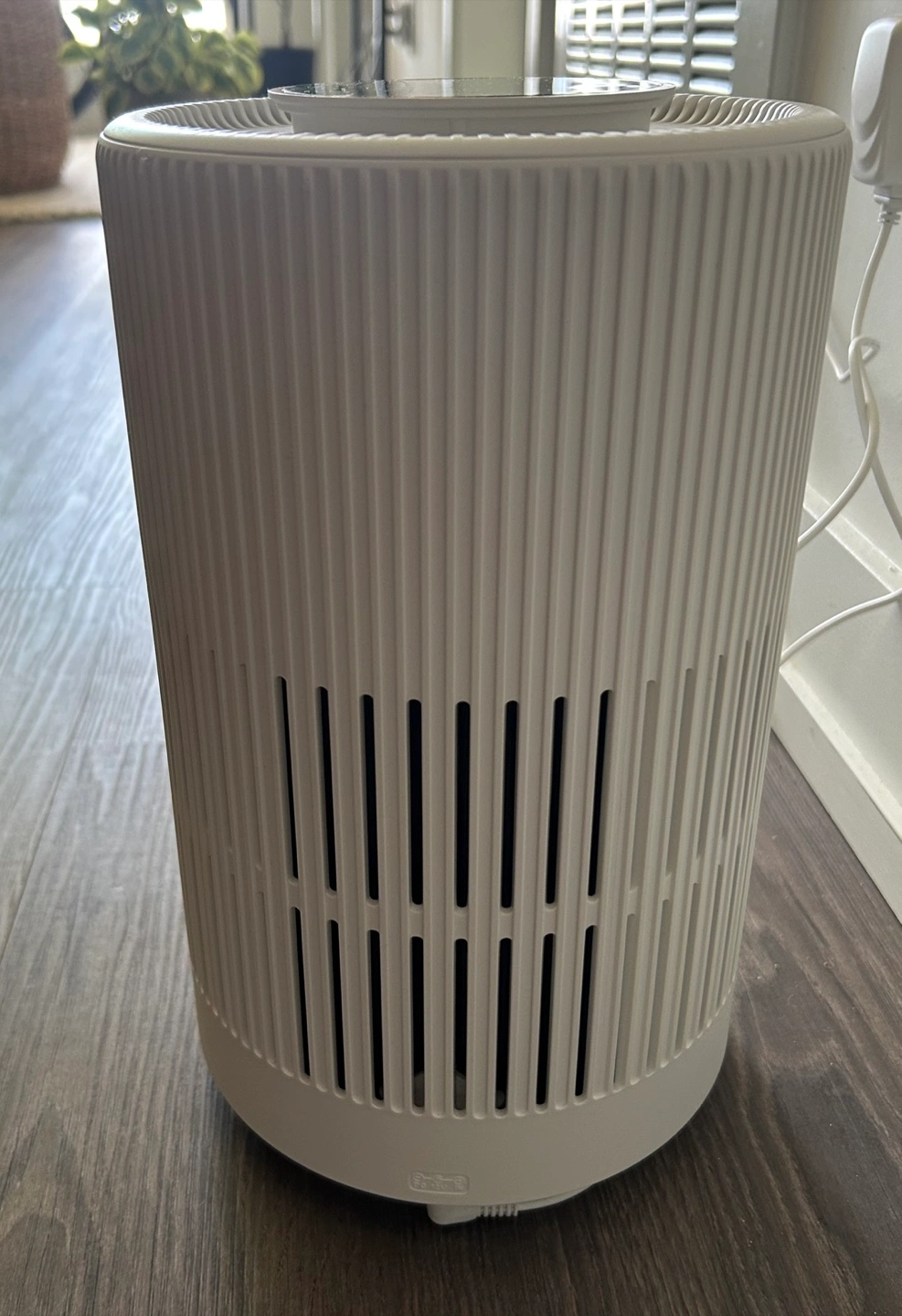 Compact air purifier. Features a 3-layer filtration system, including HEPA filter. Multiple speed settings and timer function. Child lock and sleep mode available. Ambient light.
