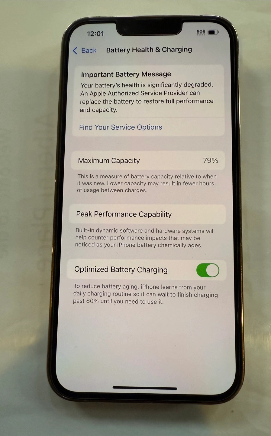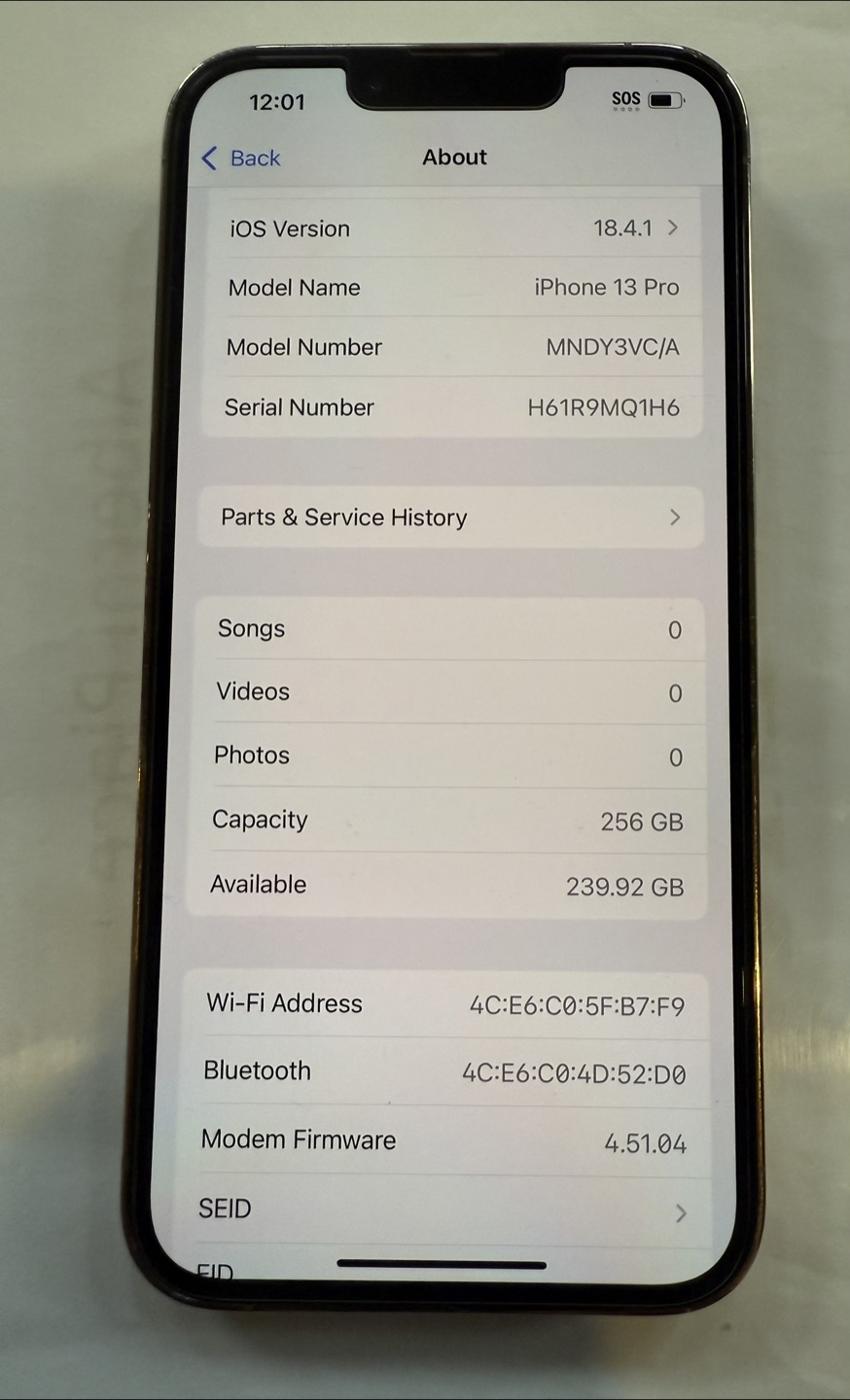 iPhone 13 Pro. 256 GB storage. Gold colour. Battery health 79%. iOS 18.4.1. Includes charger and screen protector.