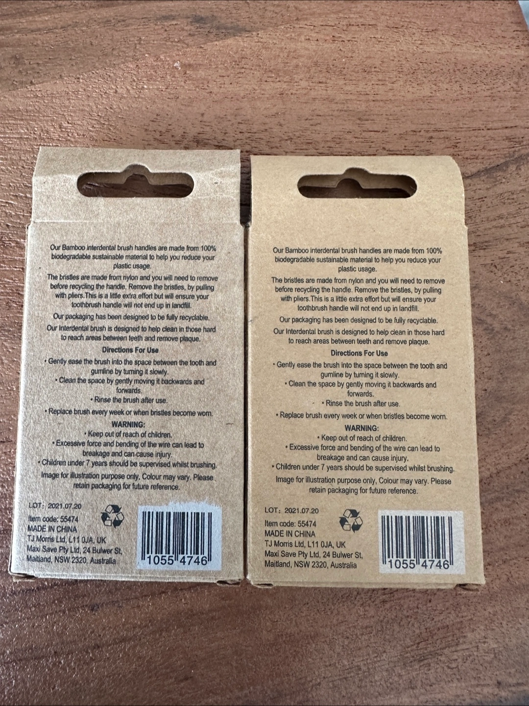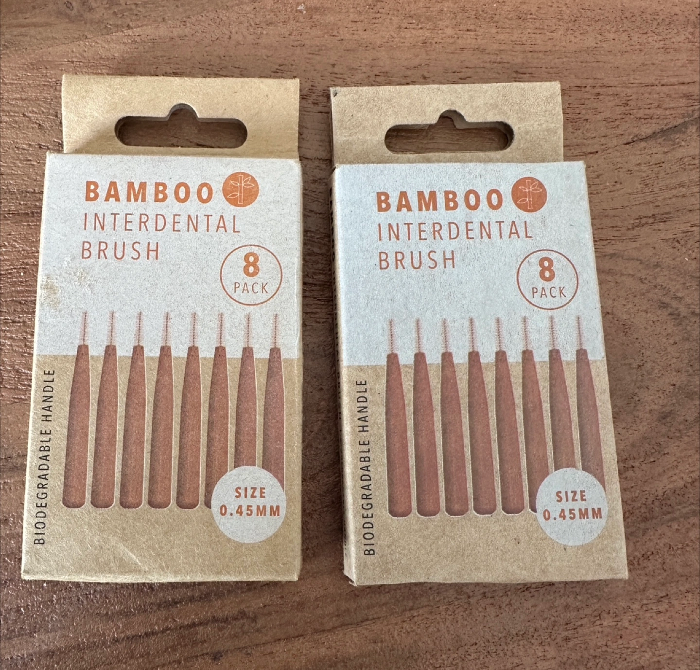 292Two packs of eight bamboo interdental brushes. Biodegradable handles, 0.45mm size. New and unopened. Both packs for $5
