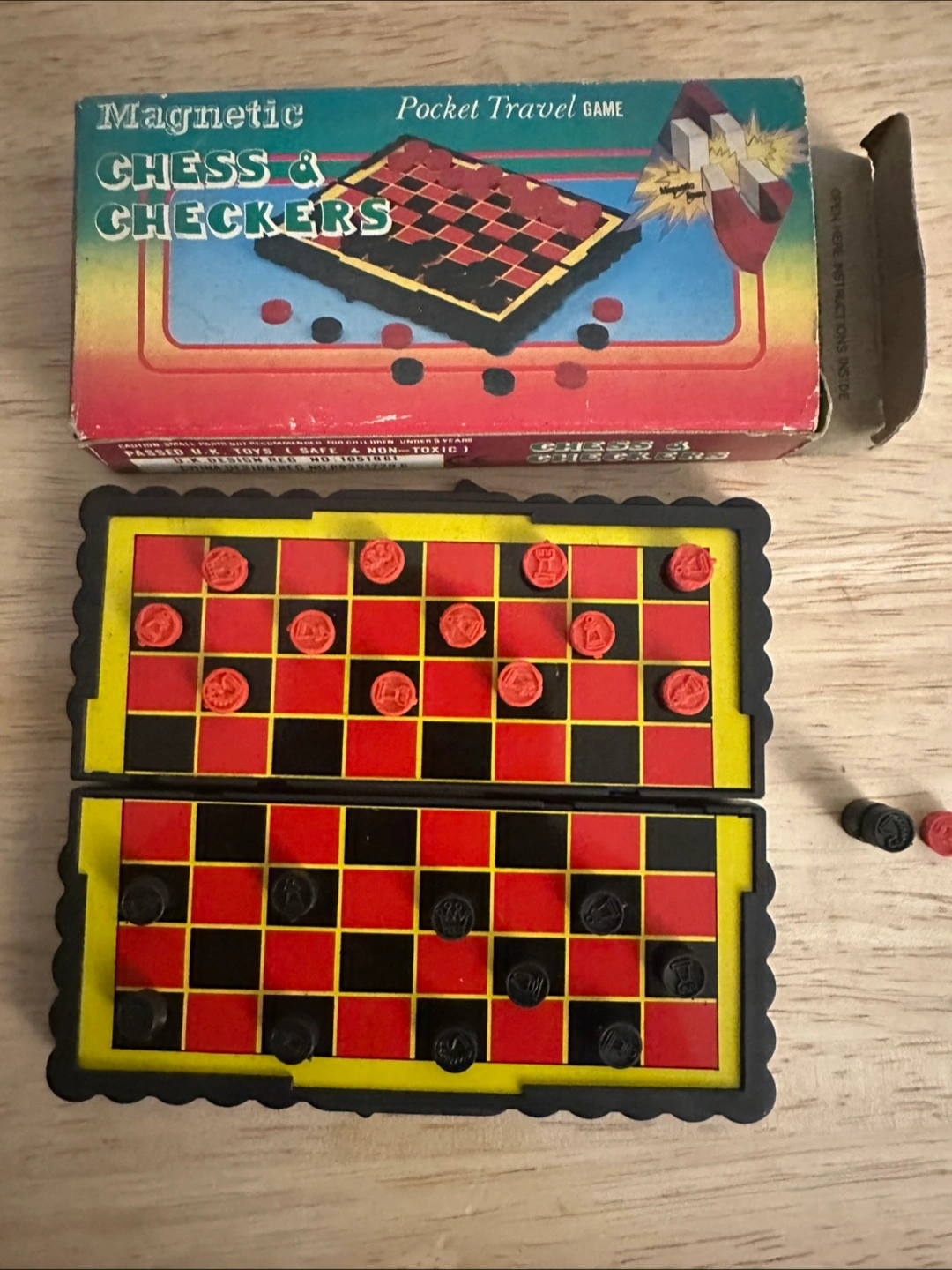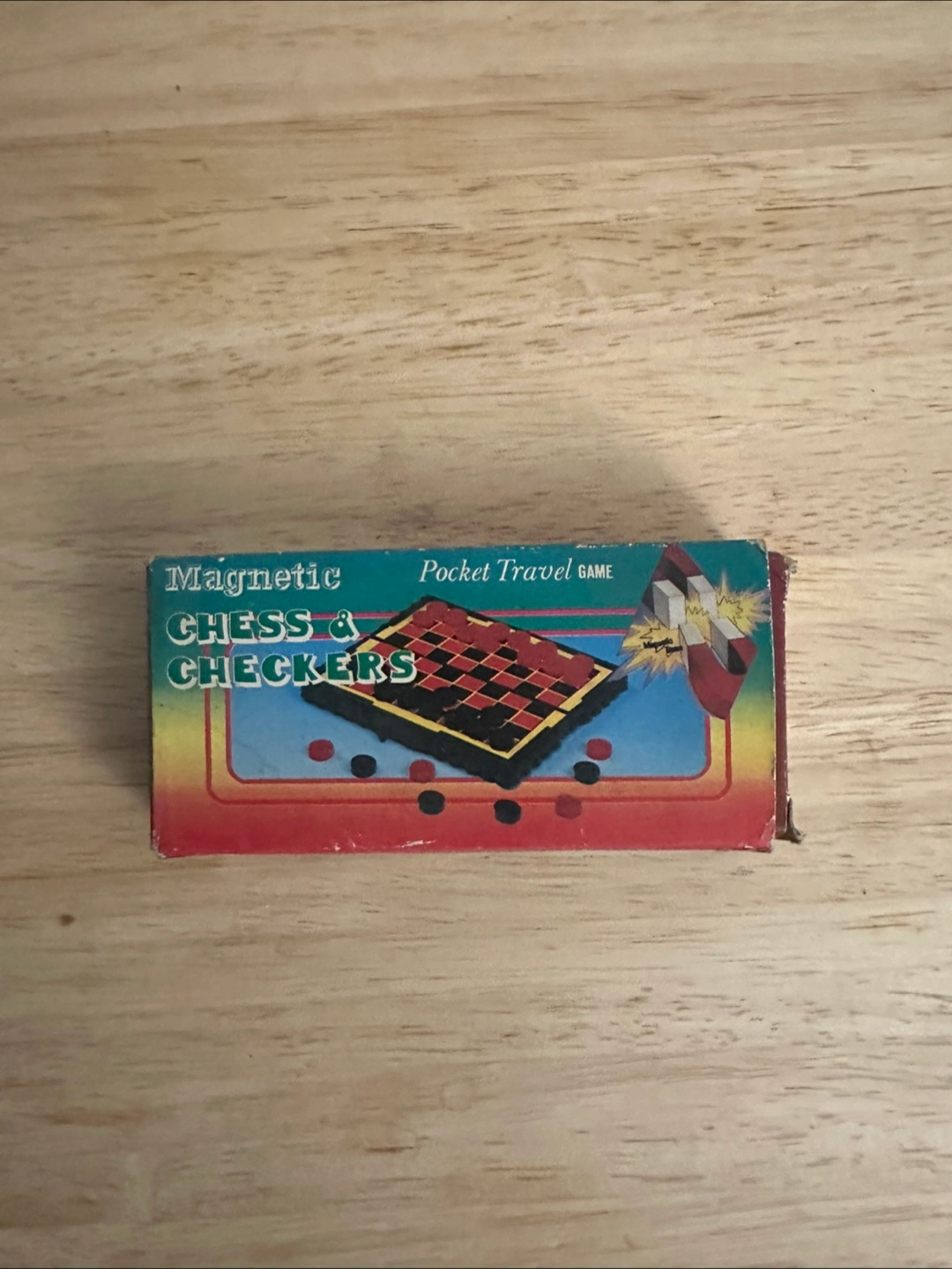 99Vintage magnetic chess and checkers travel game. Compact folding design. Perfect for travel. Includes all pieces. Box shows some wear.
