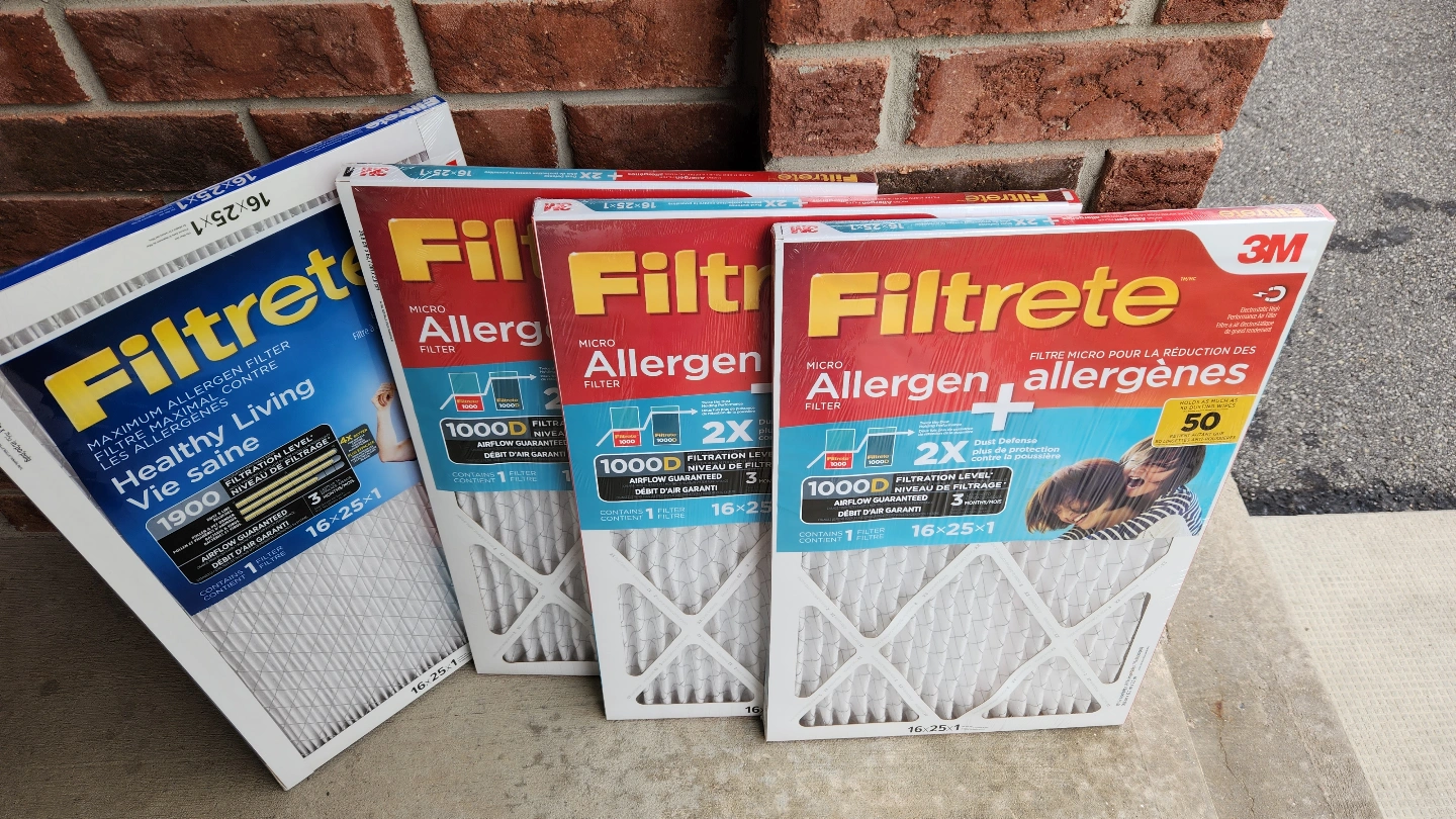 Package of 3M Filtrete Micro Allergen air filters. Size 16x25x1. Multiple filtration levels available (3 of 1000D & 1 of the 1900). Reduces airborne allergens. Healthy Living and Allergen+ options shown. Changed furnace and no longer need this size. All filters brand new and sealed. Priced at $25 for the set of 4 filters.