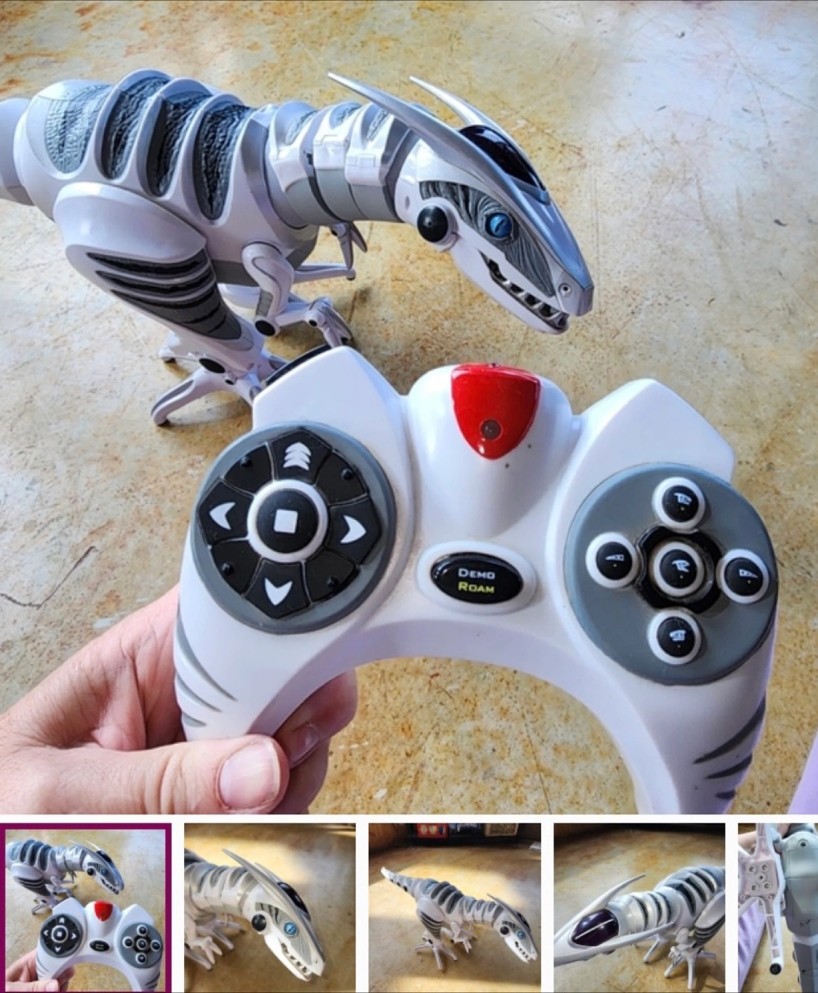 Robotic dinosaur toy. Remote control included. Features multiple functions. It roars, walk forward and backwards, moves tail etc. Lots of features and comes with remote controls.