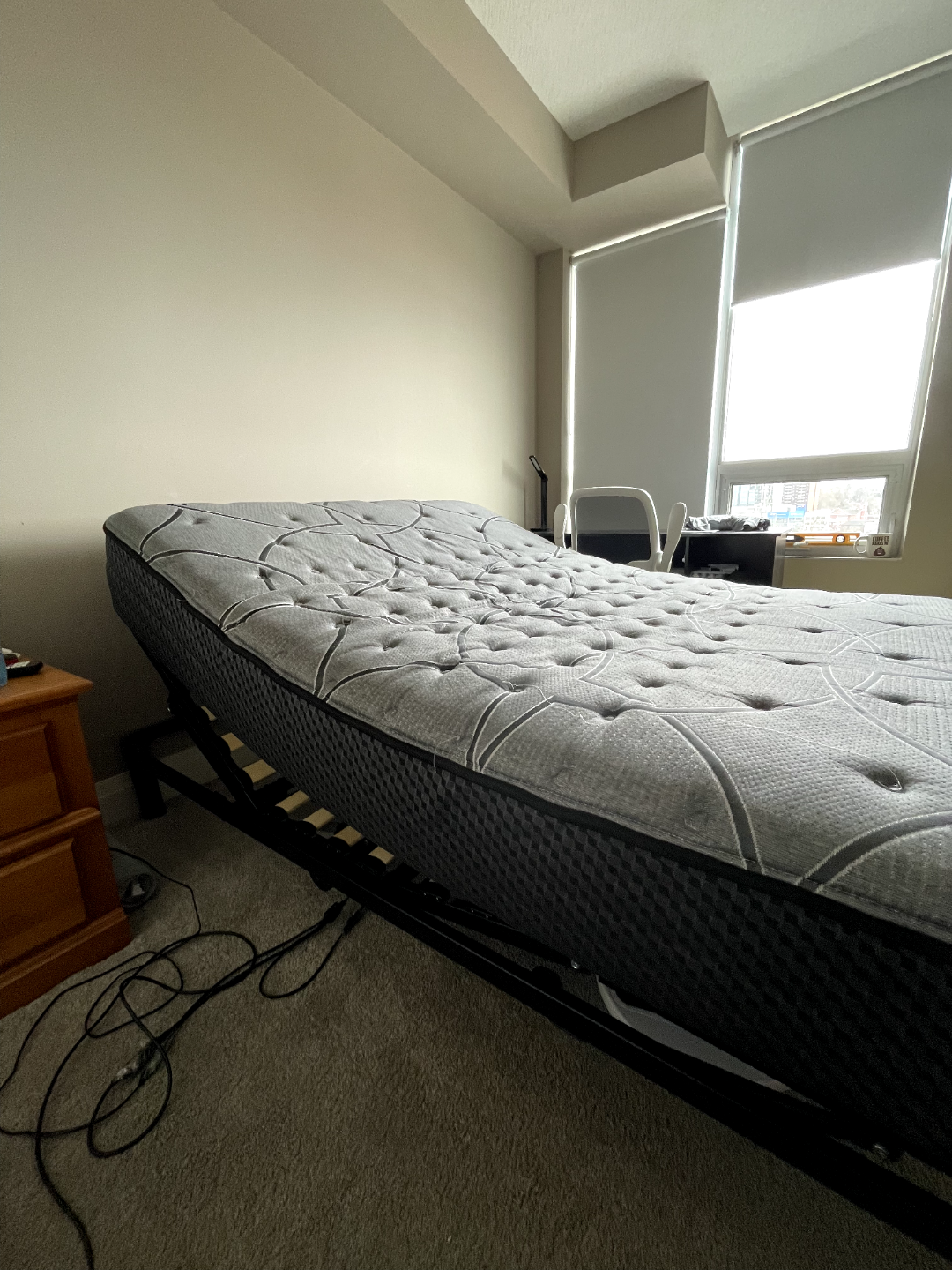 double size adjustable base mattress. Grey in excellent condition. Includes base and 2 in memory foam or best offer
