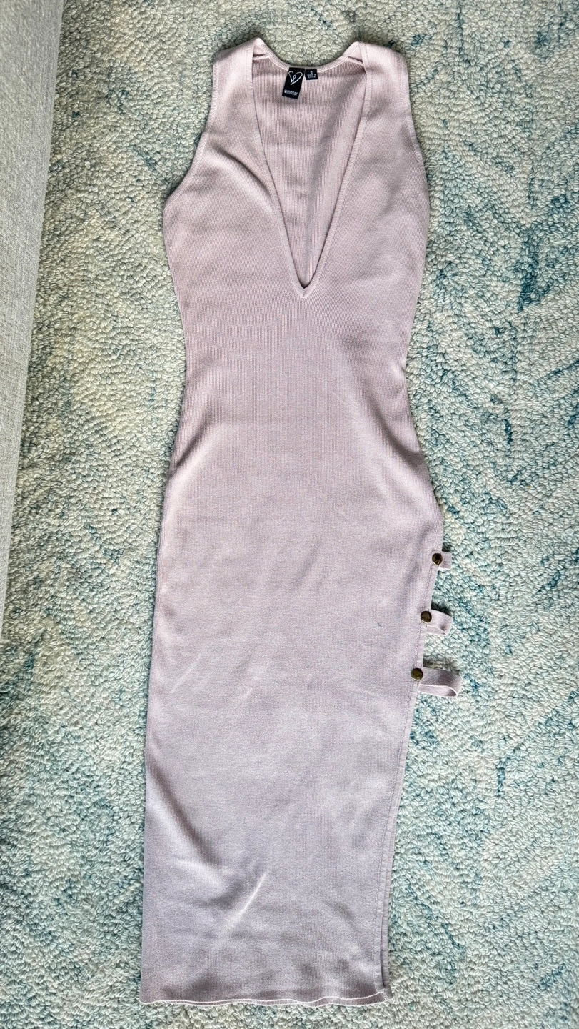 Sleeveless midi dress. Deep V-neck. Side cutouts with button details. Ribbed knit material. Lightweight and stretchy.