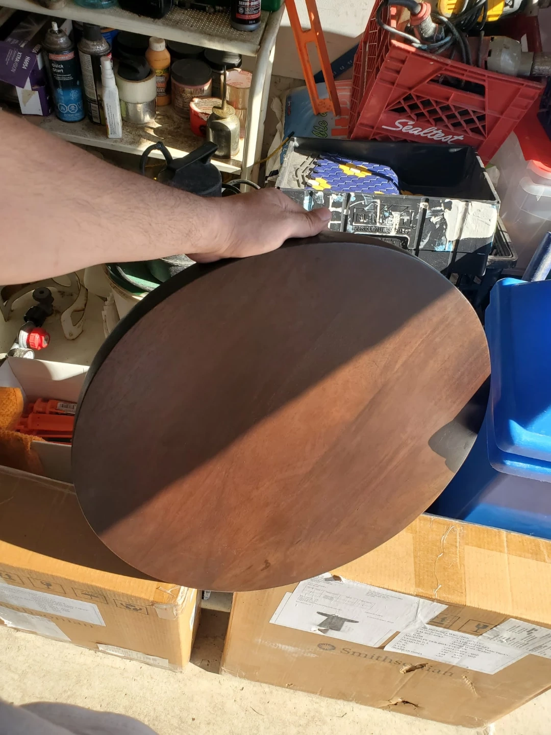 3 available Round side table tops. Mango wood. Walnut colour. 2 New in box. Some minor storage marks on box.