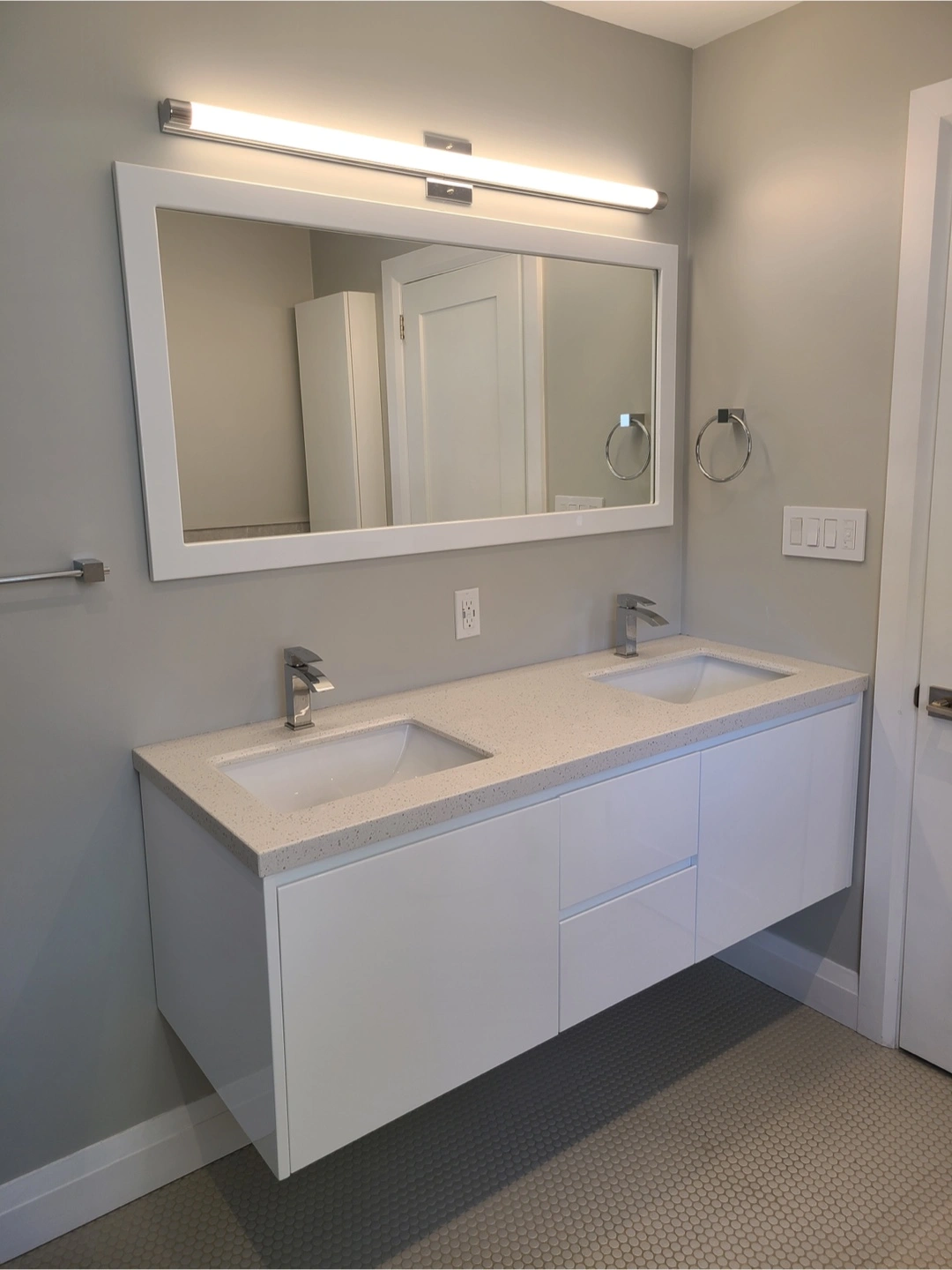 Modern rectangular mirror. White frame. Perfect for bathroom or bedroom. Good condition. Wall mounted. Mounting hardware not included. Selling because I recently replaced my bathroom mirror so no longer need this.