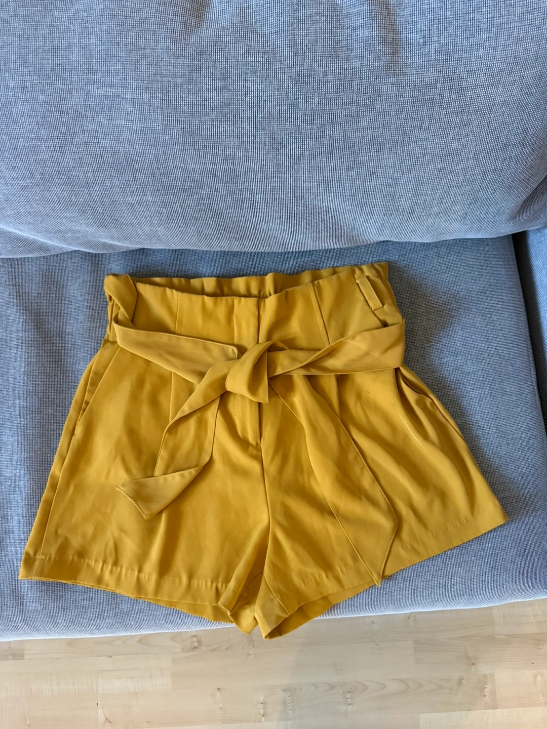 Women's high-waisted shorts. Mustard yellow colour. Features a self-tie belt. Great for summer. It is large, it’s medium too large.