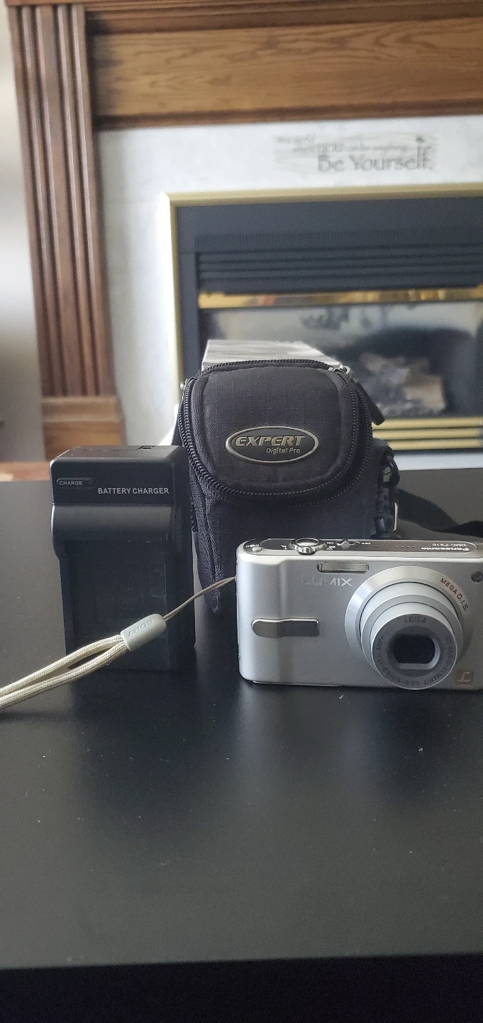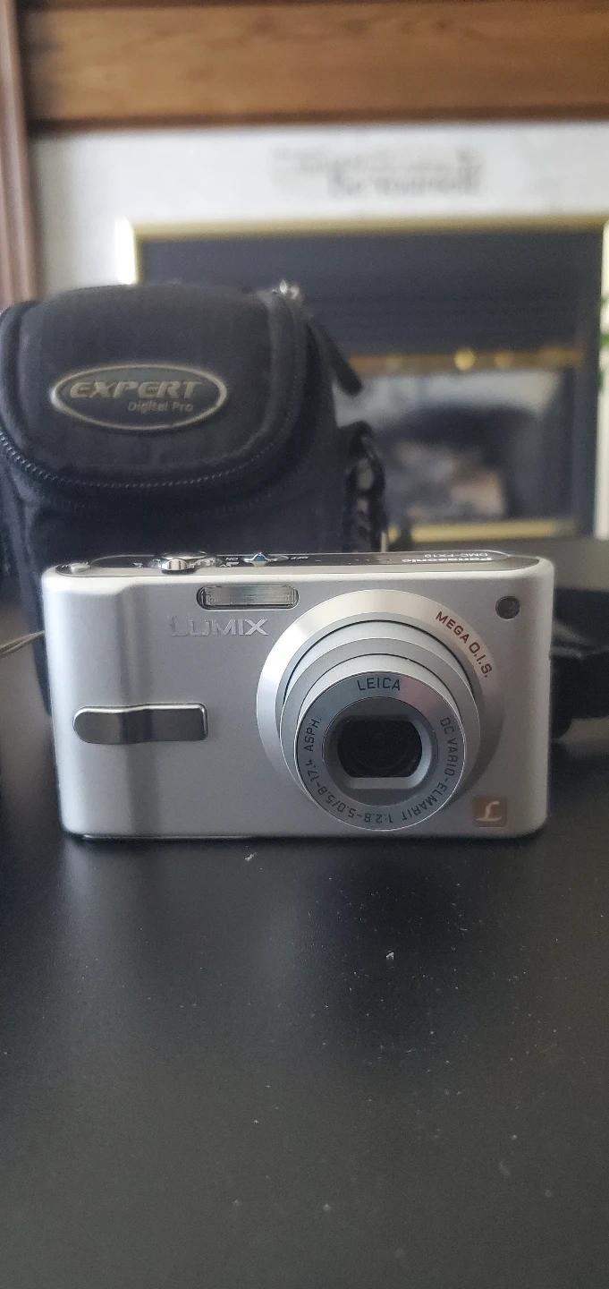 Silver Panasonic Lumix digital camera. Includes battery charger and carrying case. Camera has Leica lens.