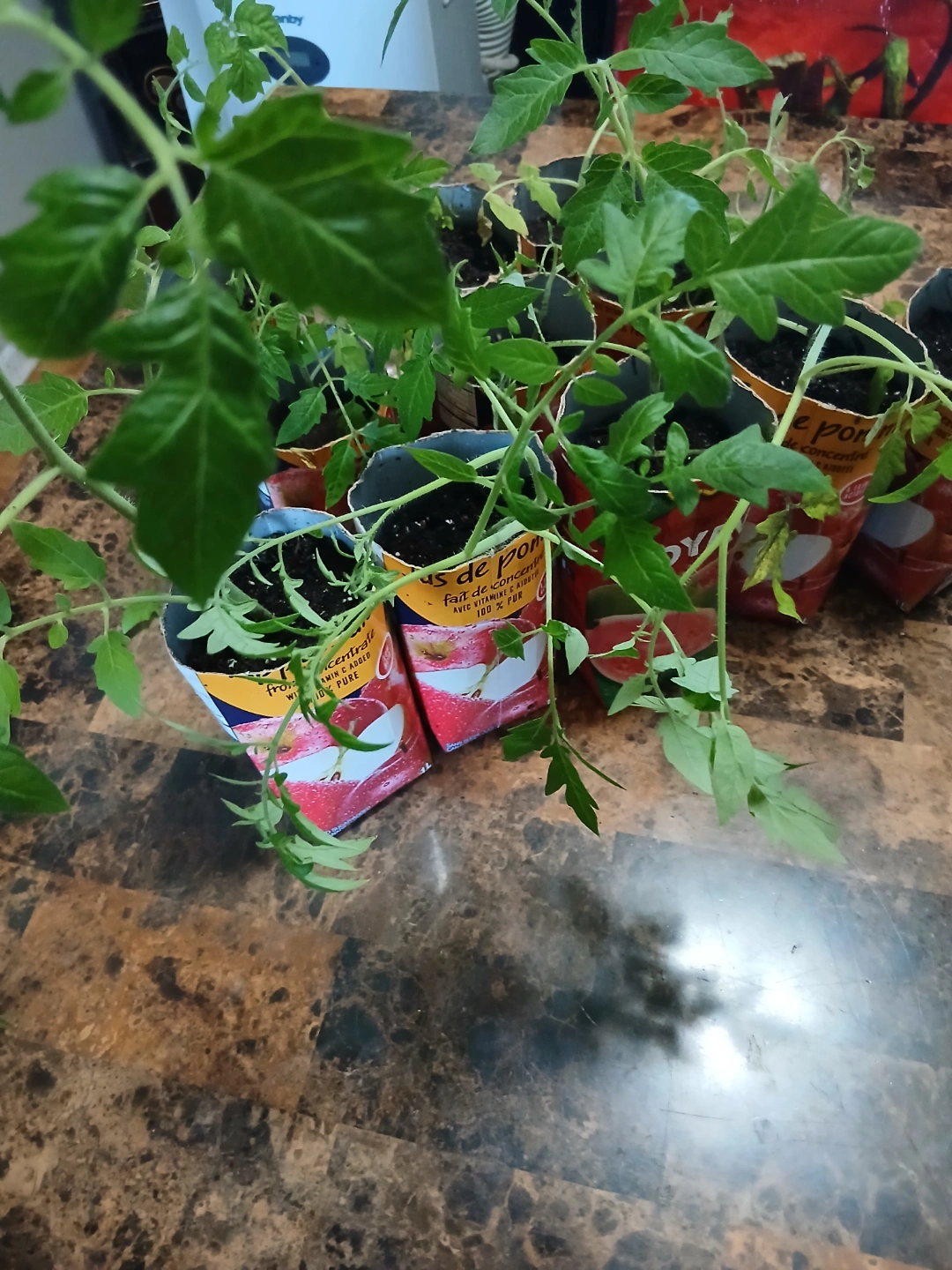 Several healthy tomato seedlings, in recycled juice cartons. Great for your garden. Plants are approximately 6-8 inches tall.