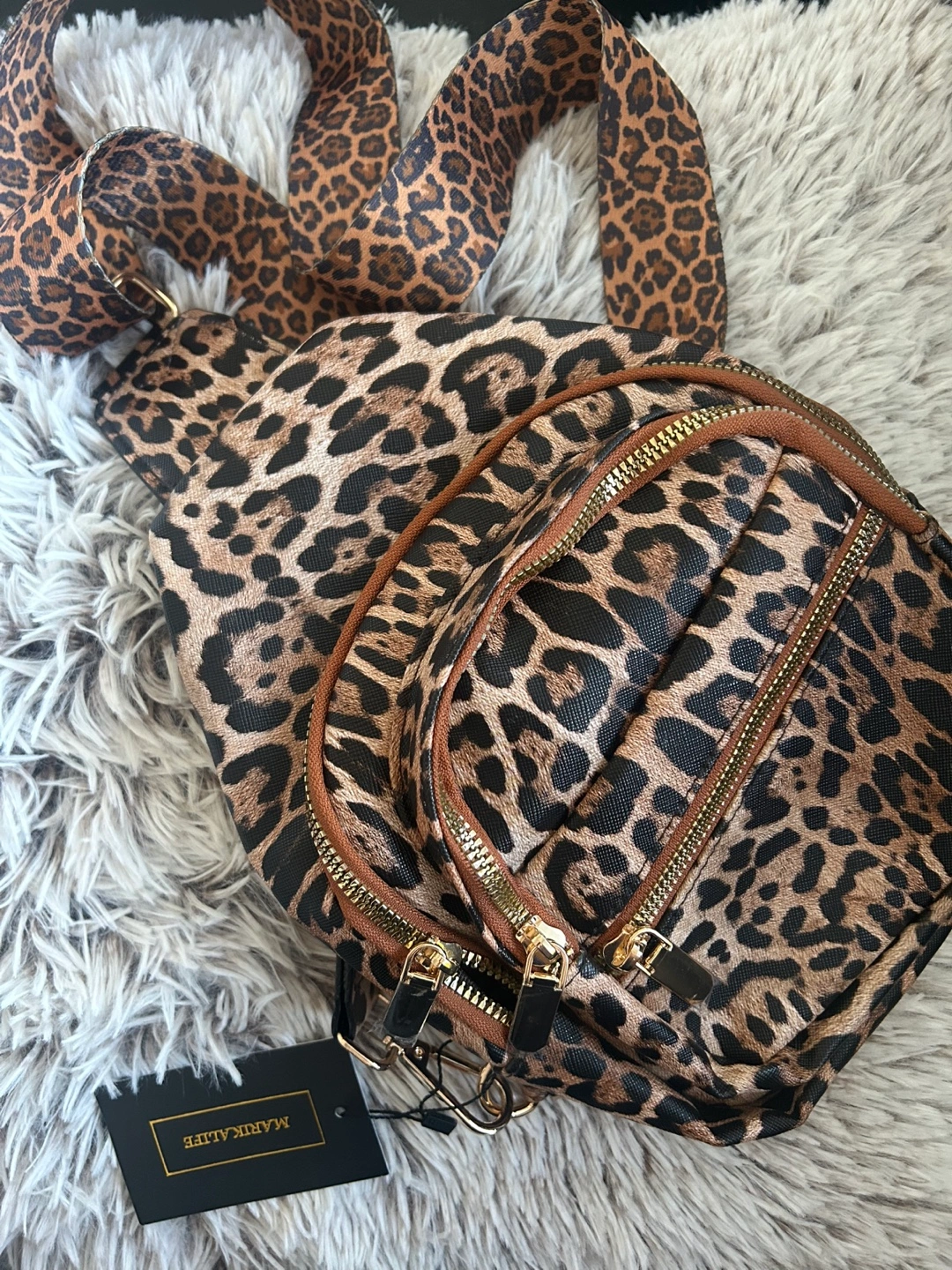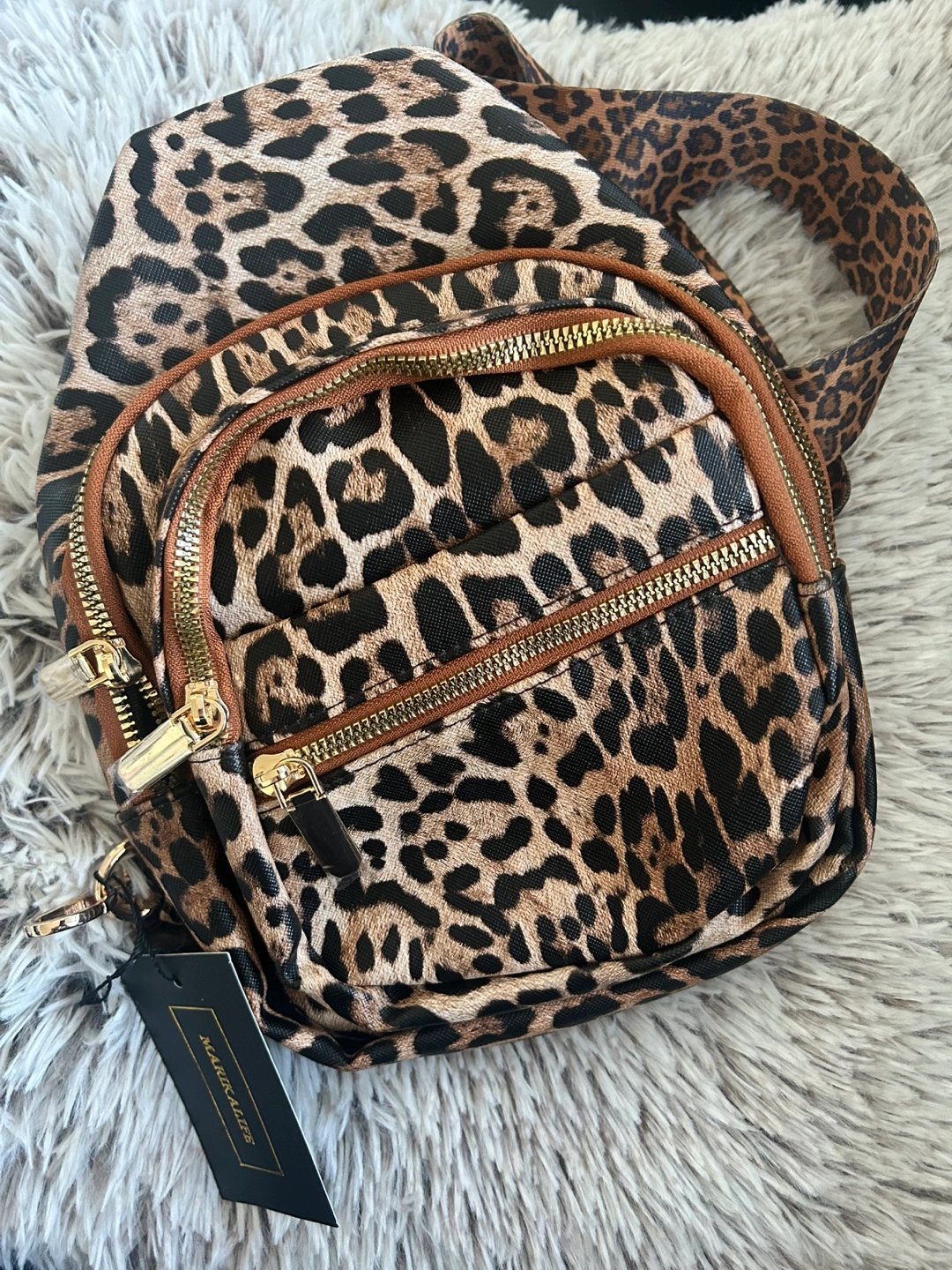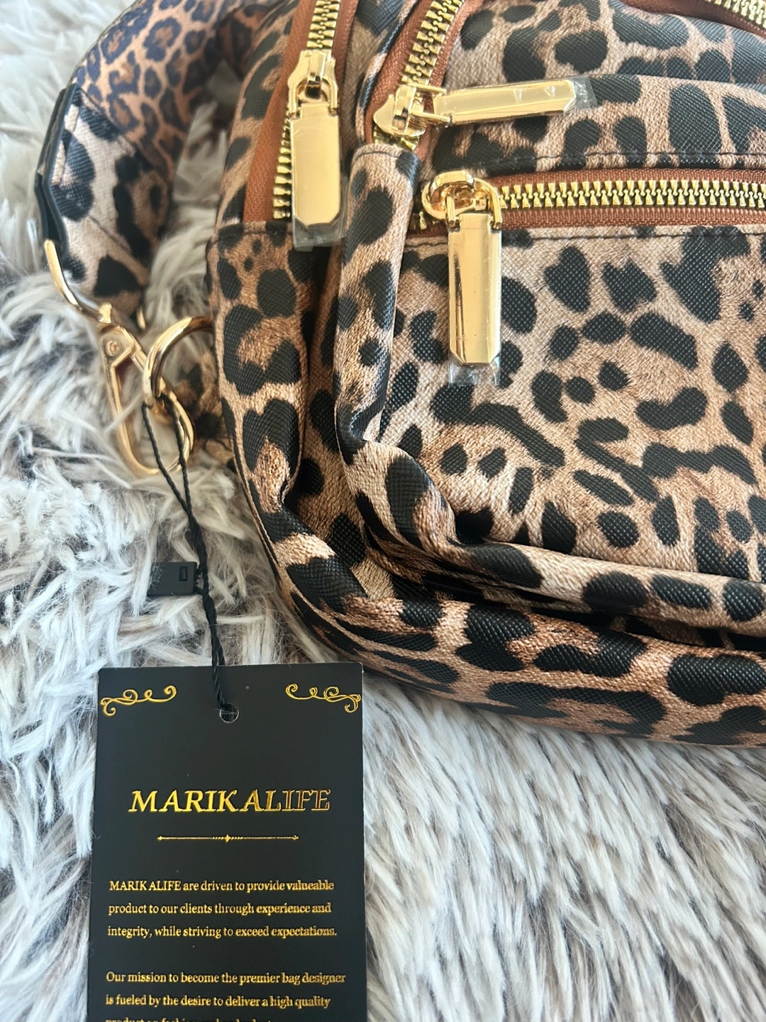 Brand new. Cute leopard print sling backpack. Features multiple zipper compartments. Adjustable strap. Perfect for everyday use.