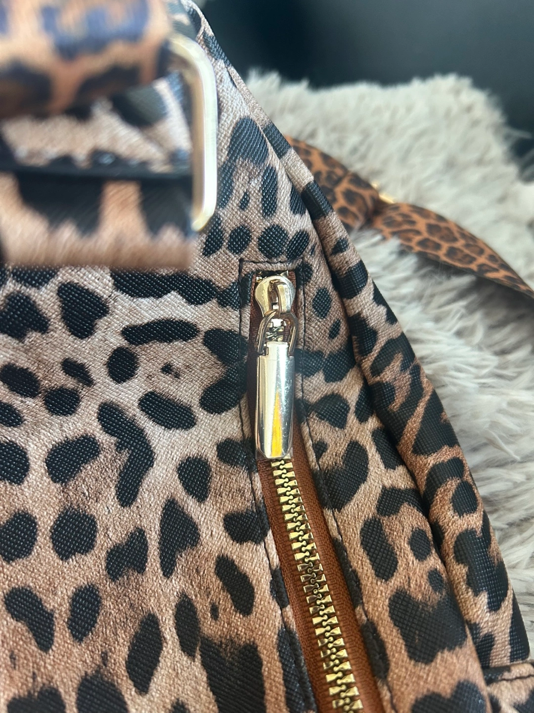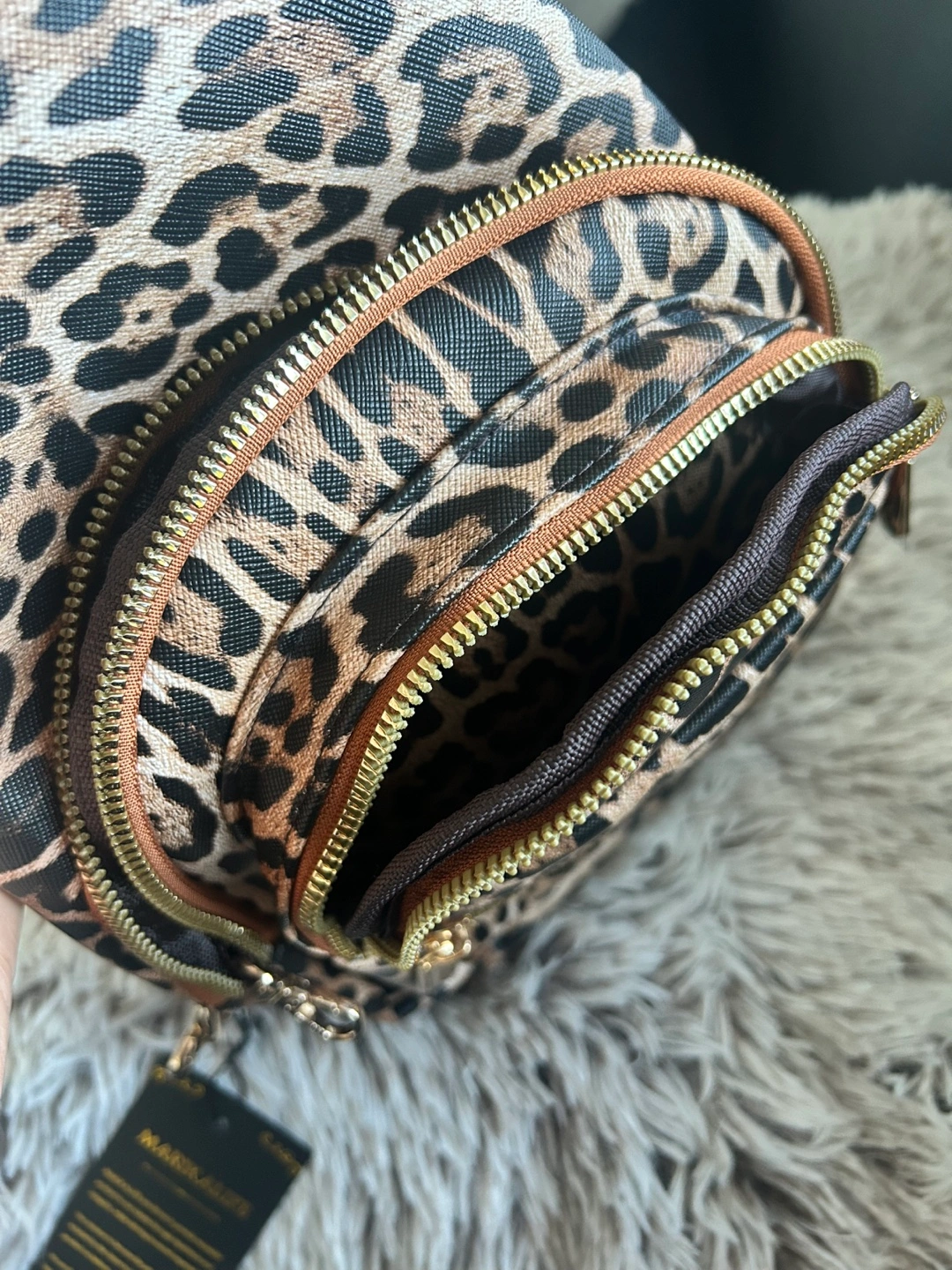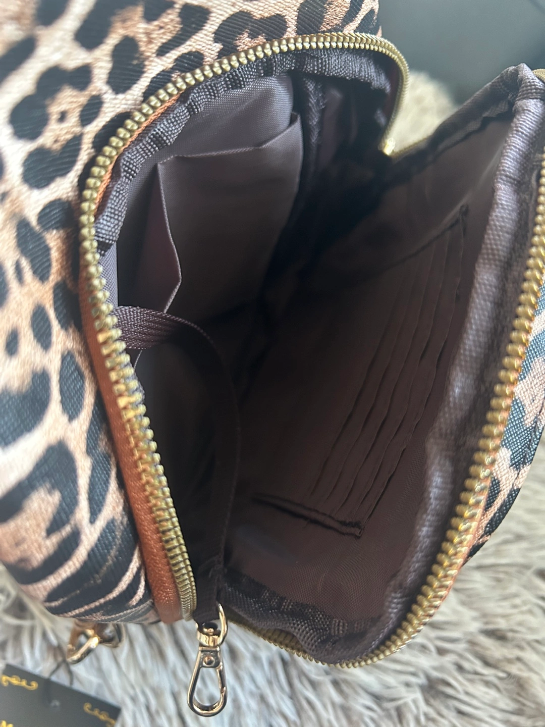 Brand new. Cute leopard print sling backpack. Features multiple zipper compartments. Adjustable strap. Perfect for everyday use.
