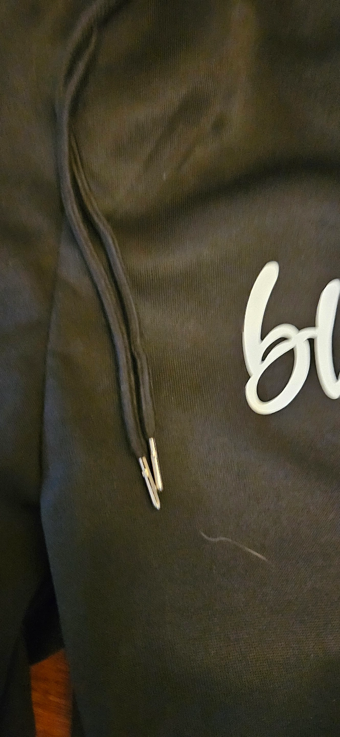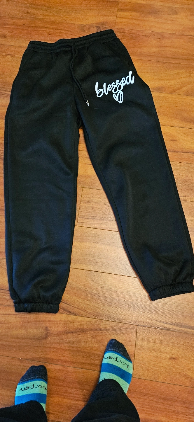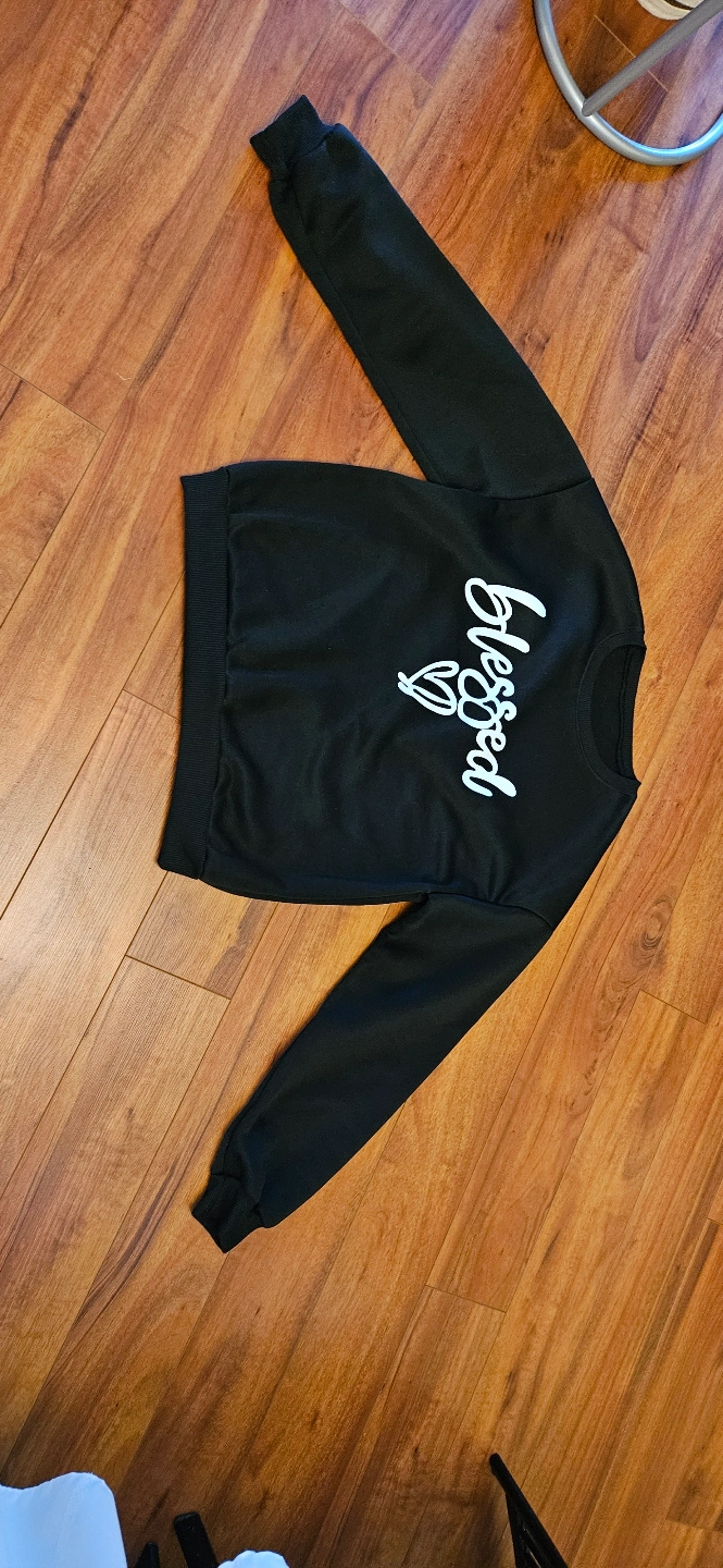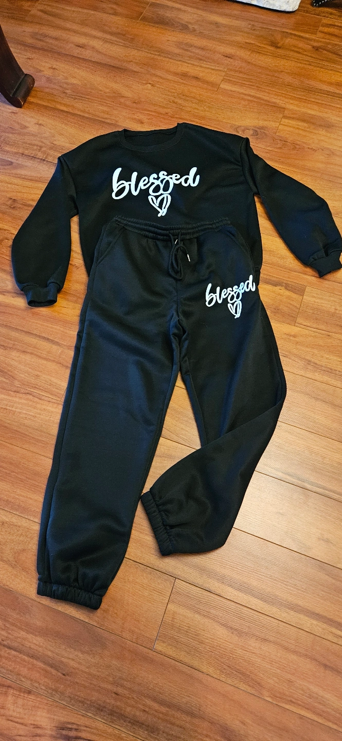Women's black lounge set. Includes sweatshirt and sweatpants. Features a white "Blessed" graphic on both pieces. Long sleeves, ribbed cuffs and waistband. Relaxed fit.