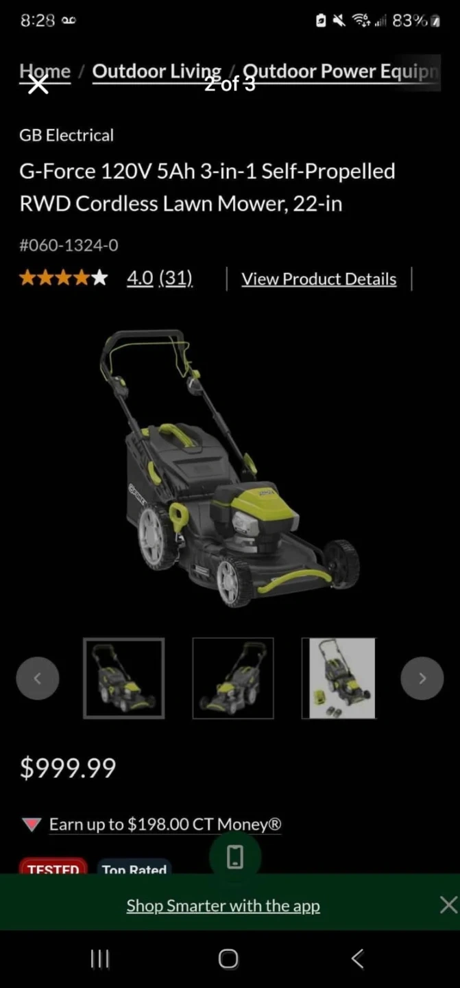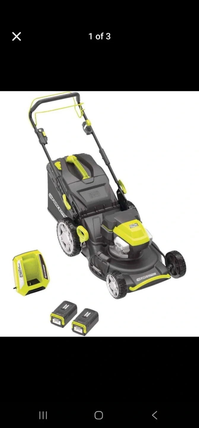This G-Force lawn mower is 120V and self-propelled. It's a 3-in-1 model with a 22-inch cutting deck. Comes with two 5Ah batteries and a charger.