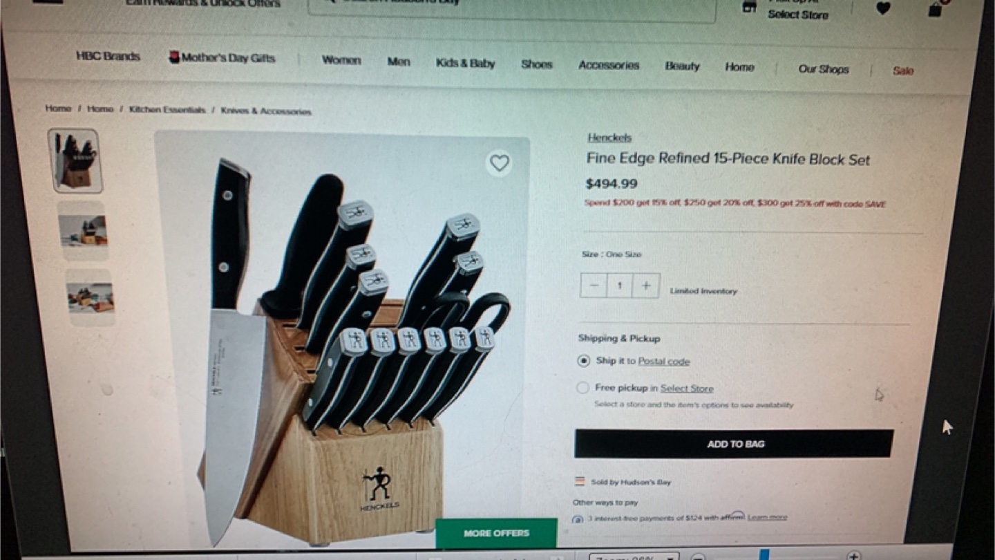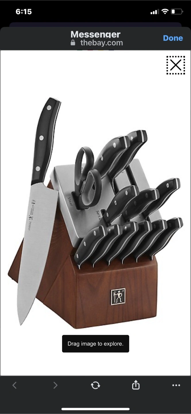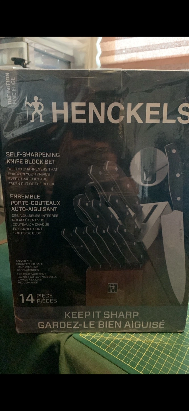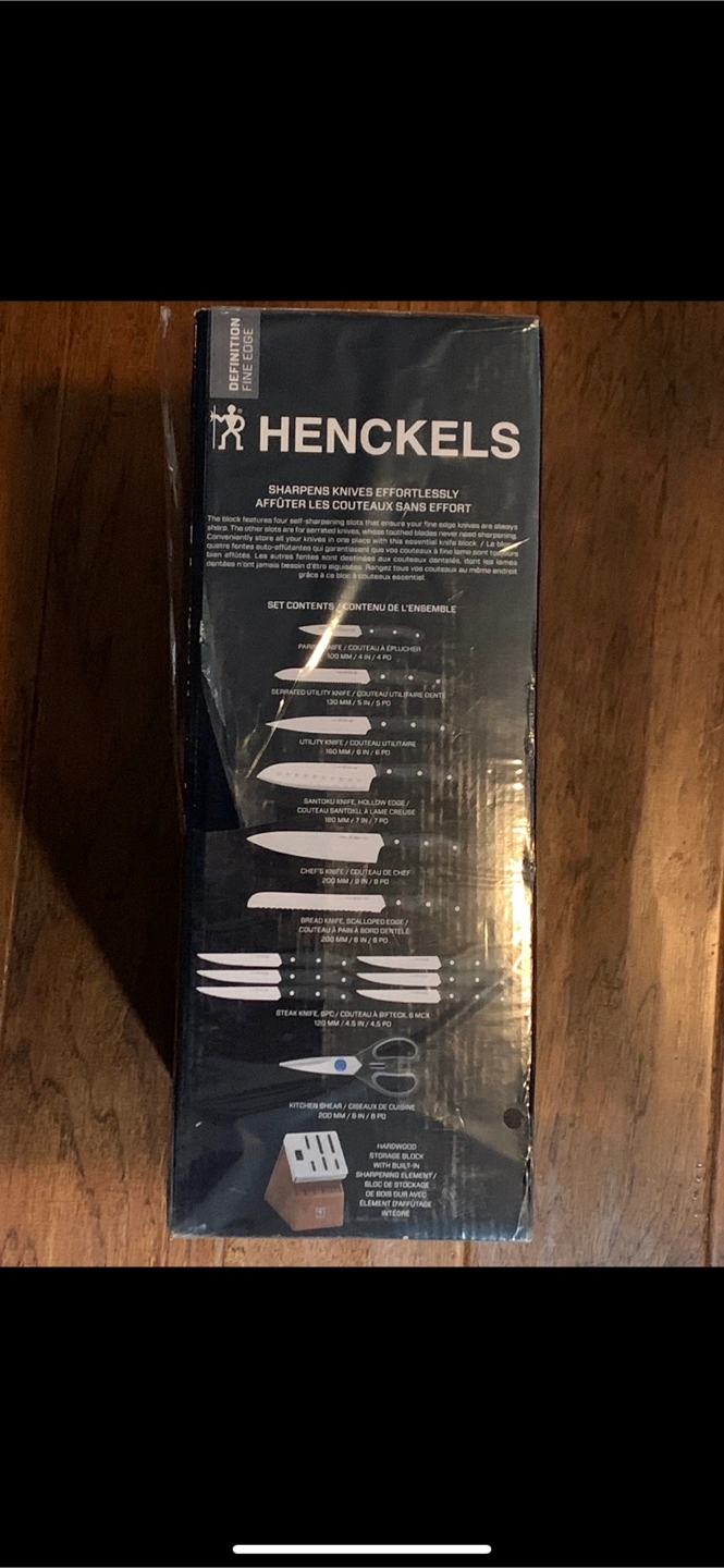 15-piece knife set. Wooden block. Black handles. Includes various knives and kitchen shears. Brand new. Bought at the BAY. For my father in law. Neaver been used it’s still wrapped in plastic