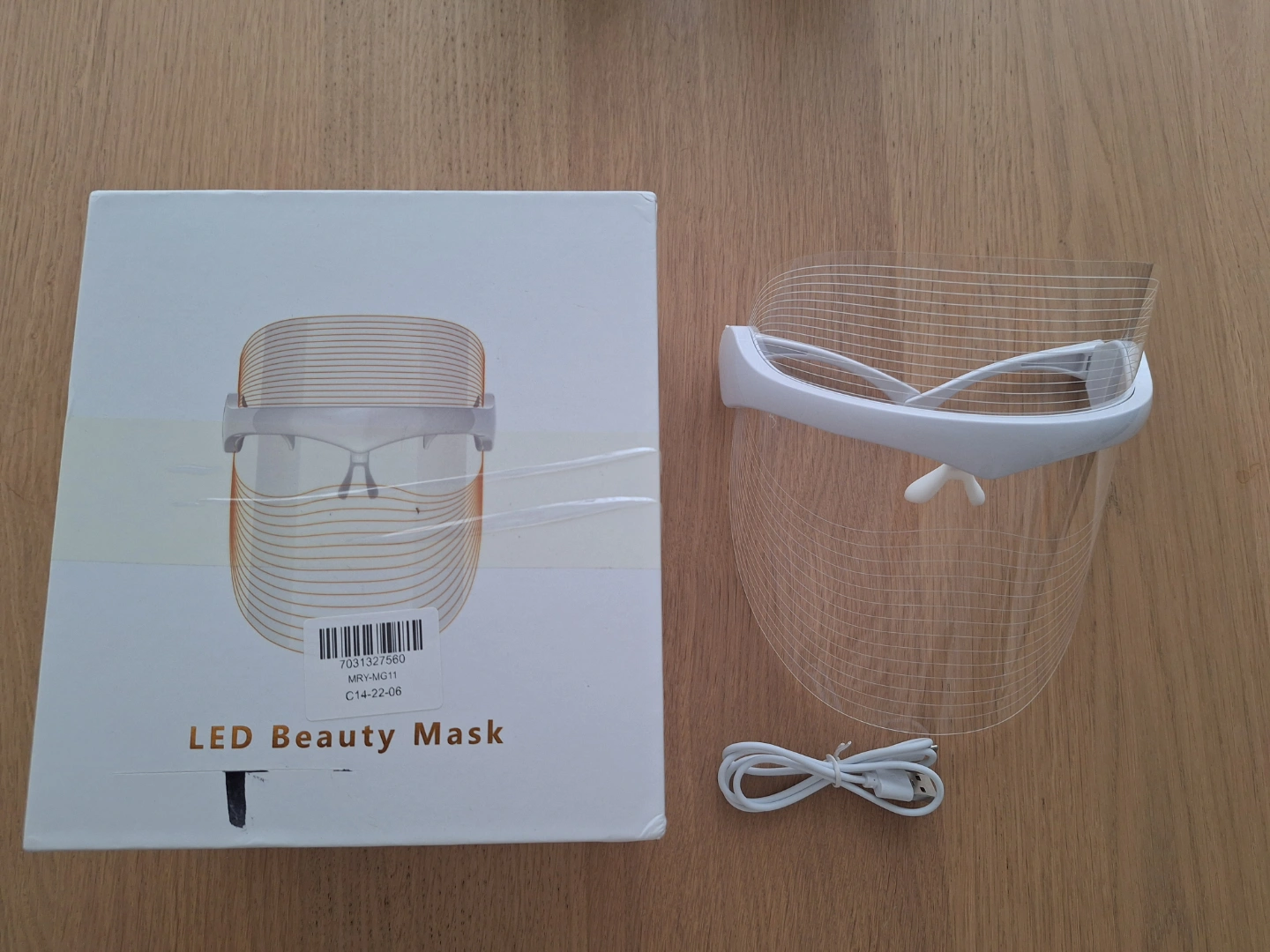 New LED light therapy mask. 7 lights. USB rechargeable. White plastic frame. Clear panel with many LED lights. Includes charging cable. Perfect for at-home skincare.