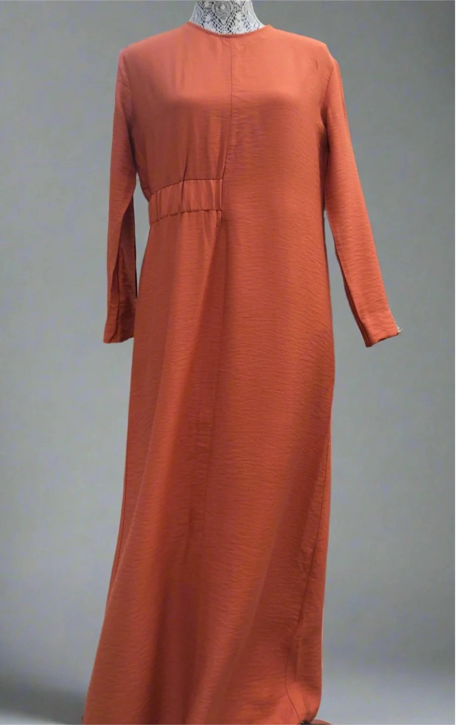 292Long-sleeved maxi dress. Features a gathered detail at the waist. Burnt orange colour. Relaxed fit. Size small - new, never worn $15