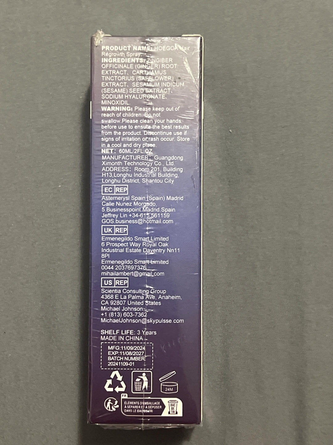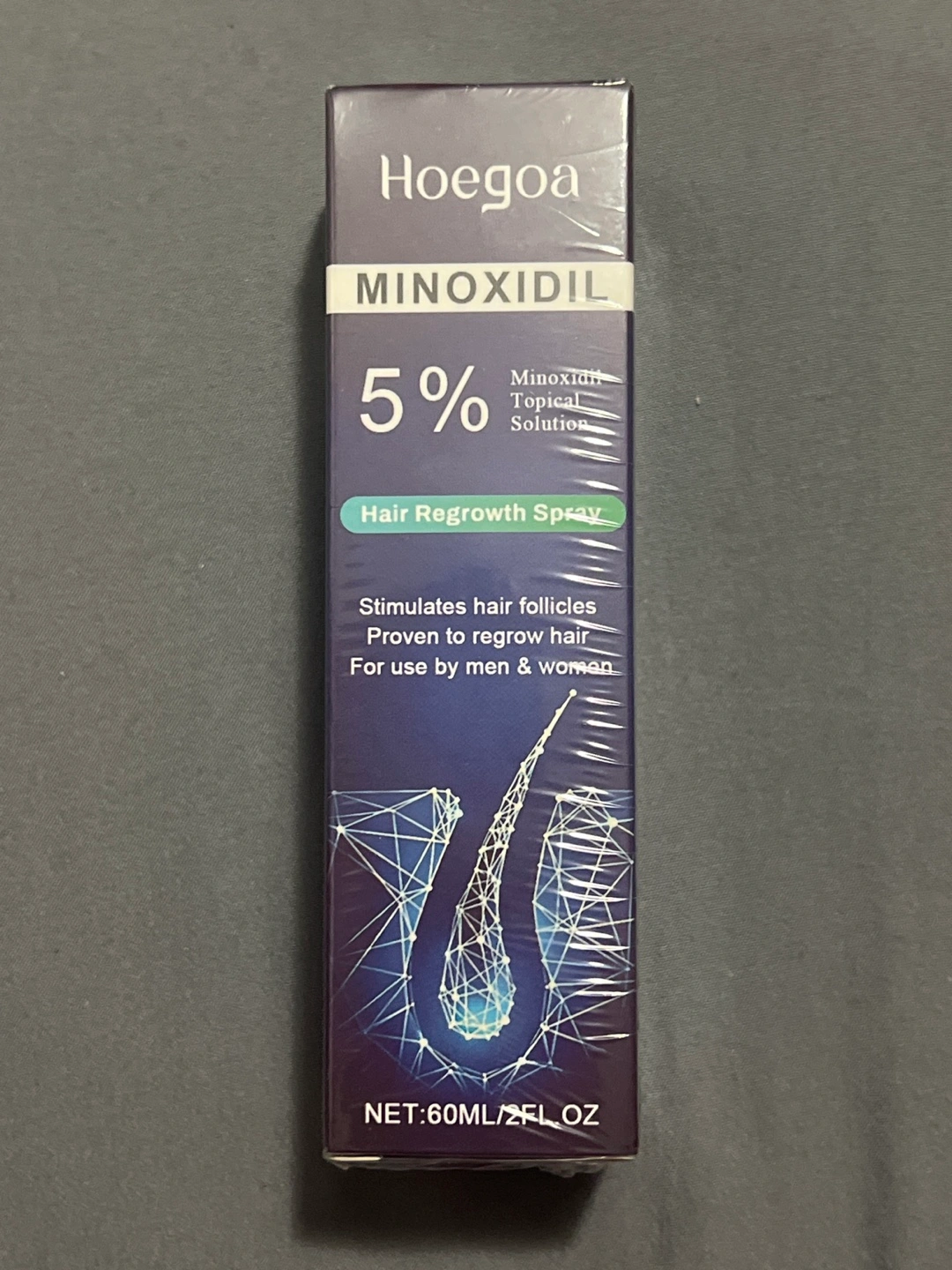 Hair regrowth spray. Stimulates hair follicles. Proven to regrow hair. For men & women. 60ml bottle. Directions for safe use included.