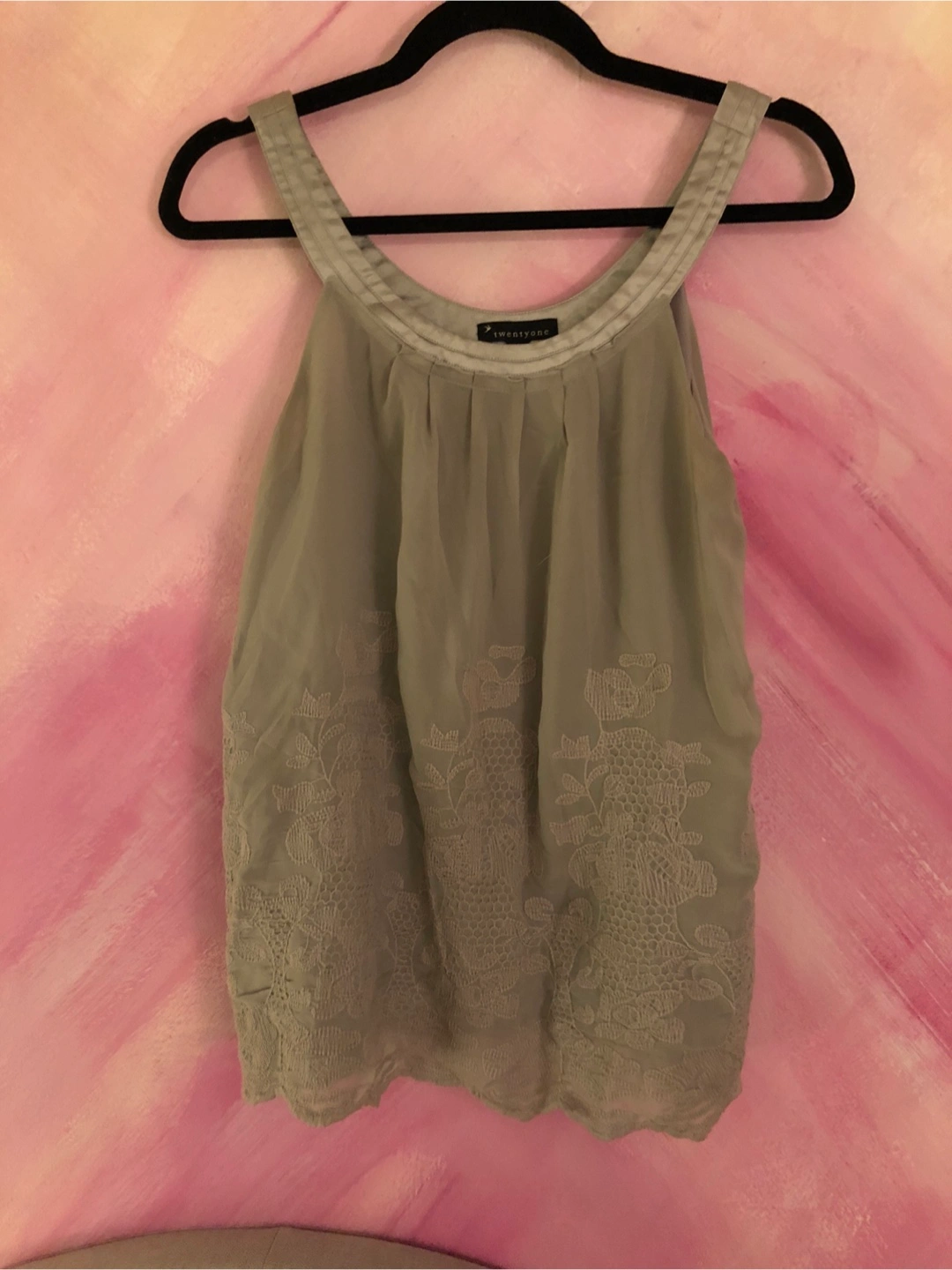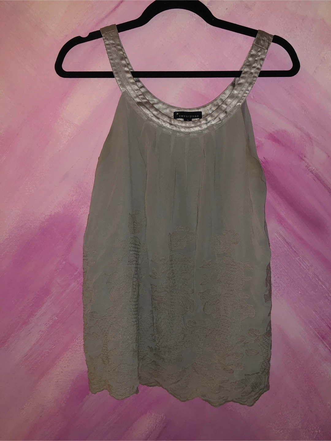 Flowy, sleeveless top. Light gray color. Embroidered detailing. Silvery neckline. Relaxed fit.