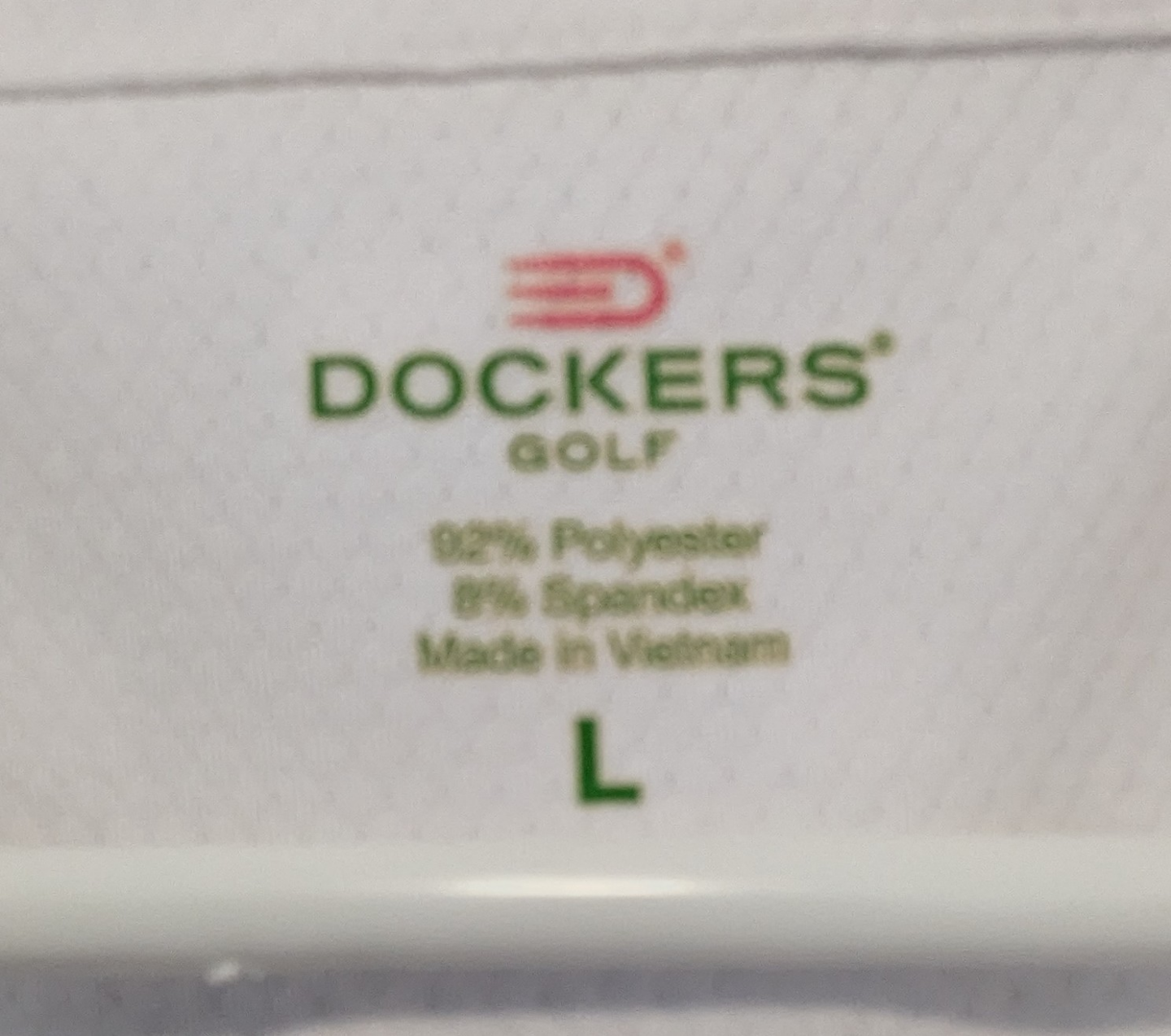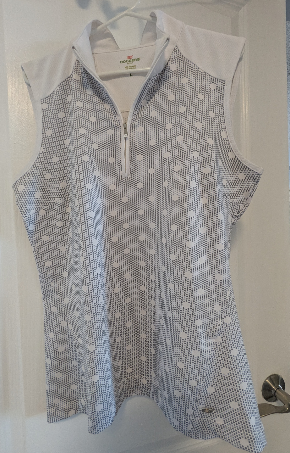 White and grey sleeveless golf polo. Small grey polka dot pattern. Size large. 92% polyester, 8% spandex. Great fitting top.