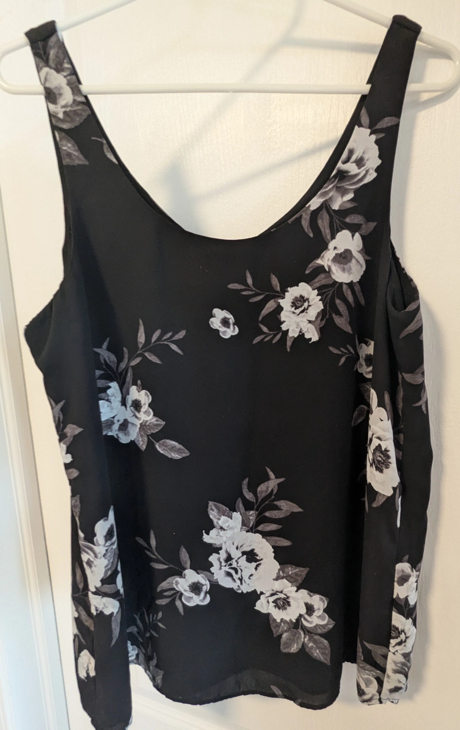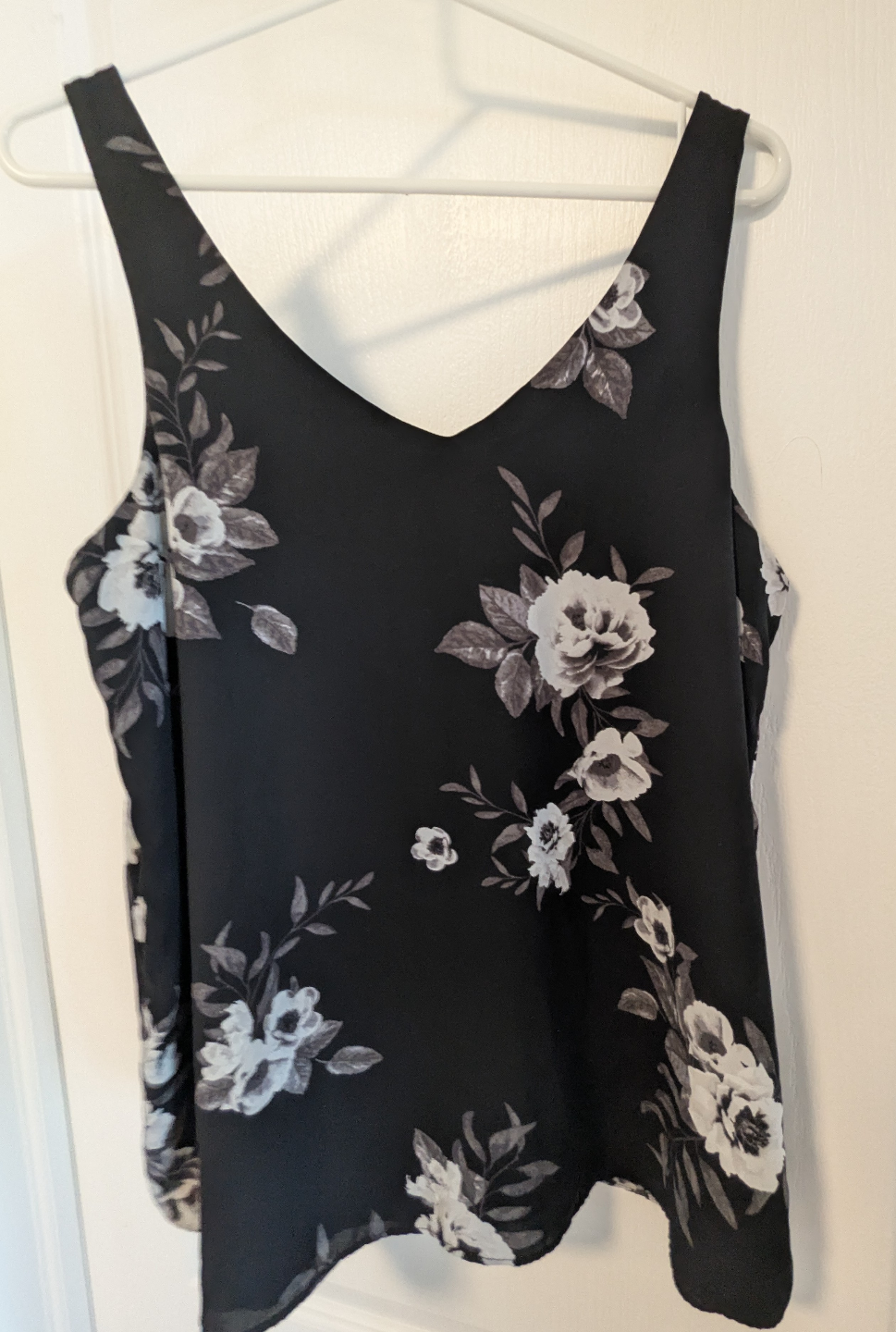 Women's sleeveless tank top. Black background with a white and grey floral print. Relaxed fit. Lightweight material, suitable for summer.