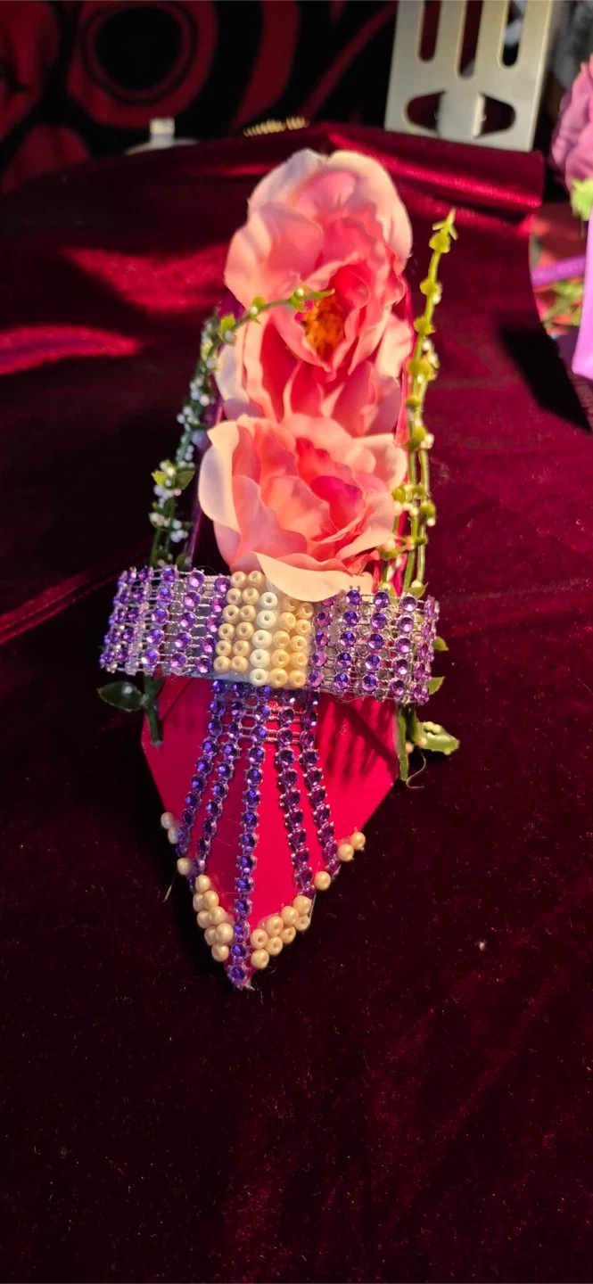This is a decorative shoe clip with pink roses and purple beading. It features a bright pink base adorned with rhinestones and pearls. A fun accessory for any shoe!