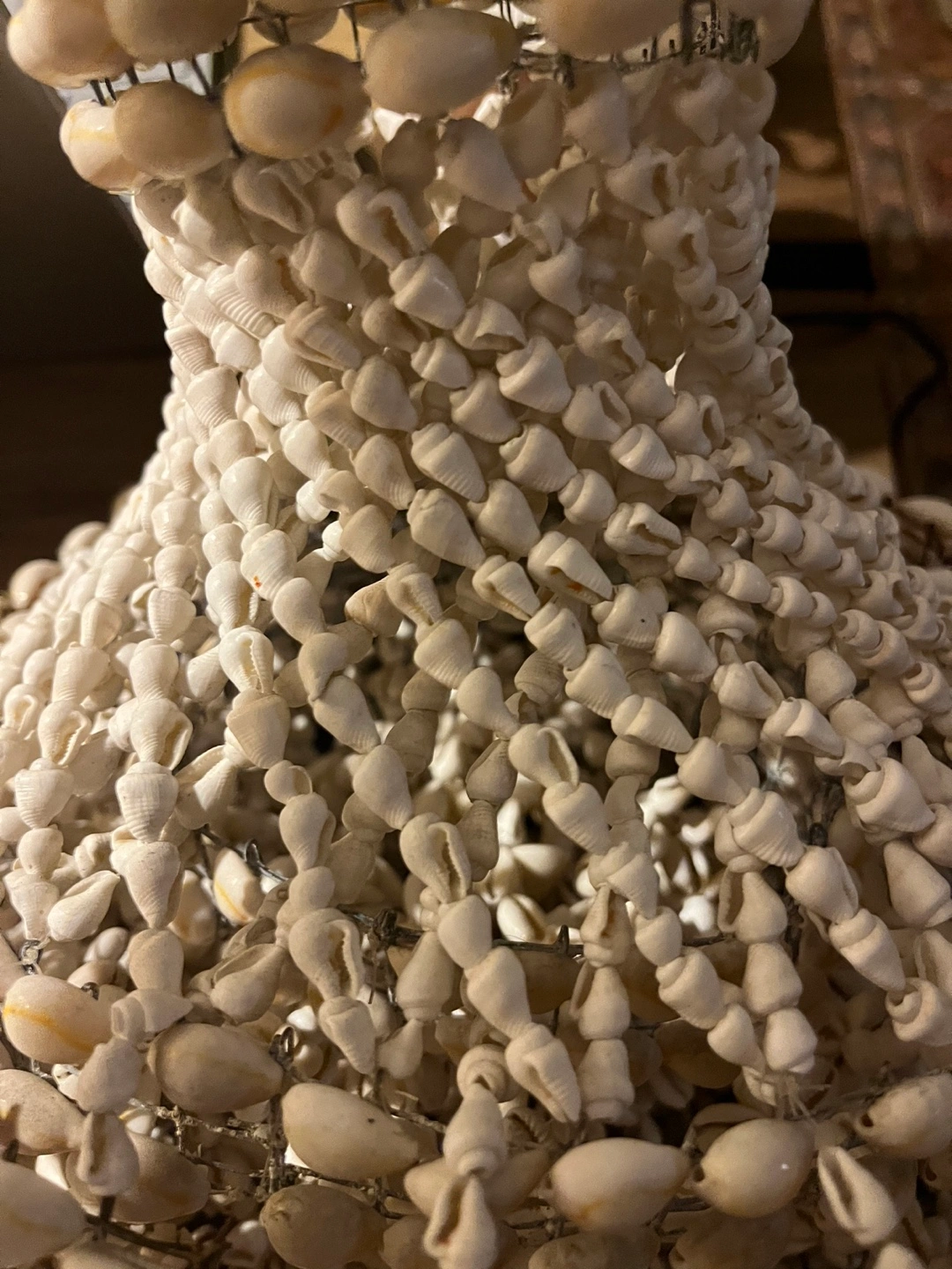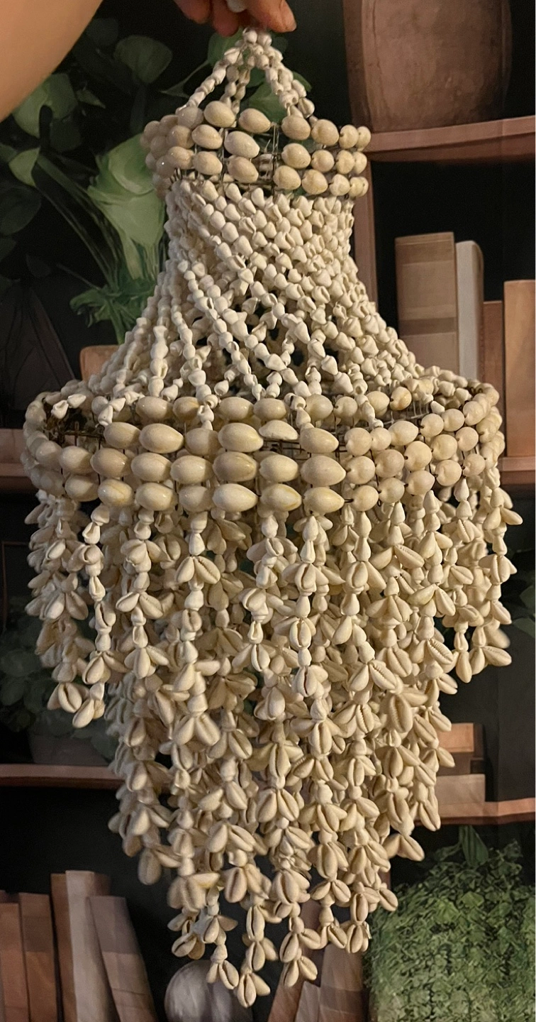 Vintage Handcrafted seashell chandelier. Intricate design. White shells. Metal wire frame. Bohemian style. Adds coastal charm to any room.