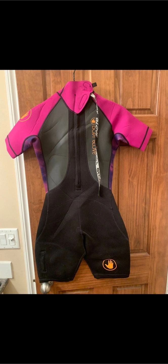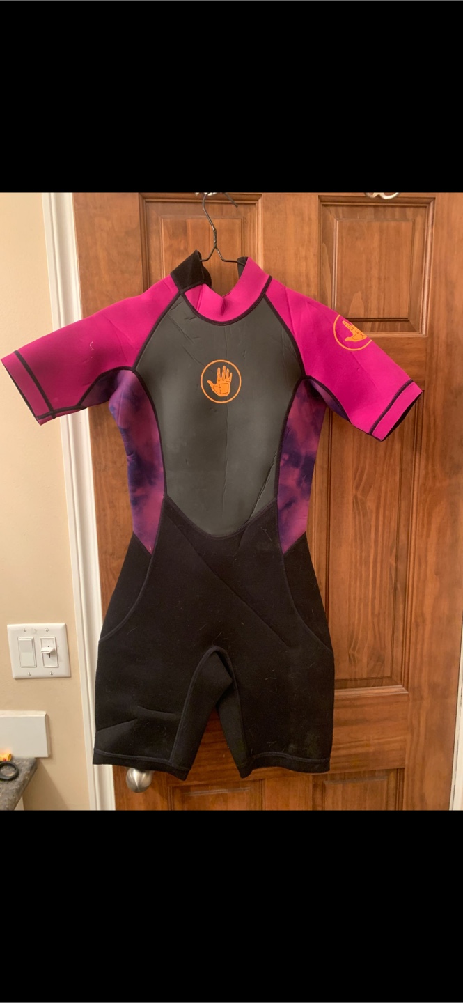 Women's Body Glove shorty wetsuit. Size medium. Pink and black. Short sleeves and legs. Good condition. Used 2-3 time’s waterskiing. 2.5mm thick