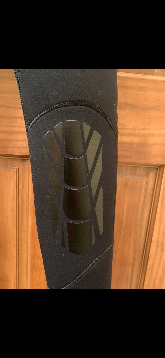 Black 5mm neoprene wetsuit. Full-length zipper. Reinforced knee pads. Blue accents on sleeves. 5mm thick. Bought never warn