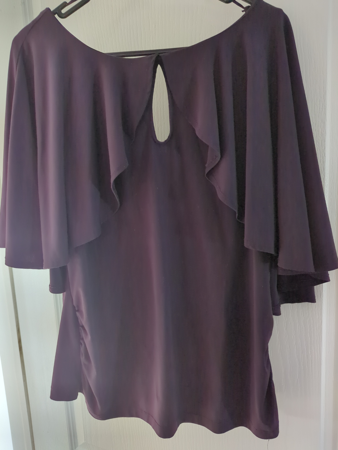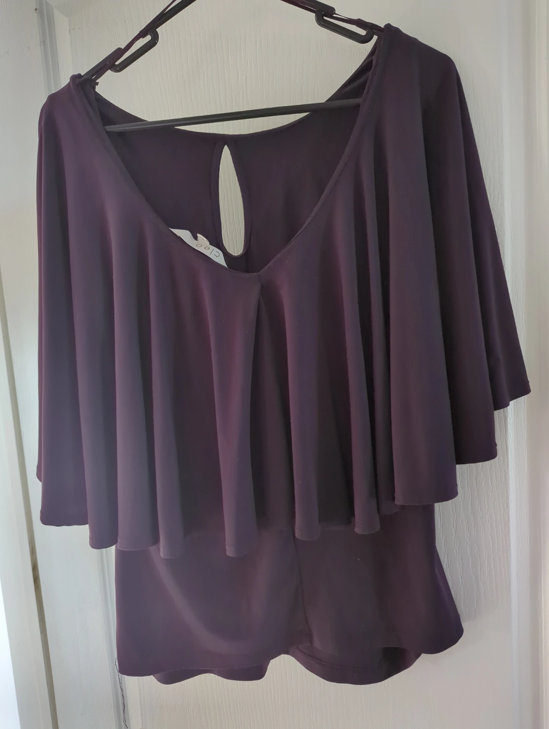 Beautiful dark purple blouse. Features capelike sleeves, keyhole front and low back with cape. Size large. Soft, stretchy material. Perfect for a night out or special occasion.