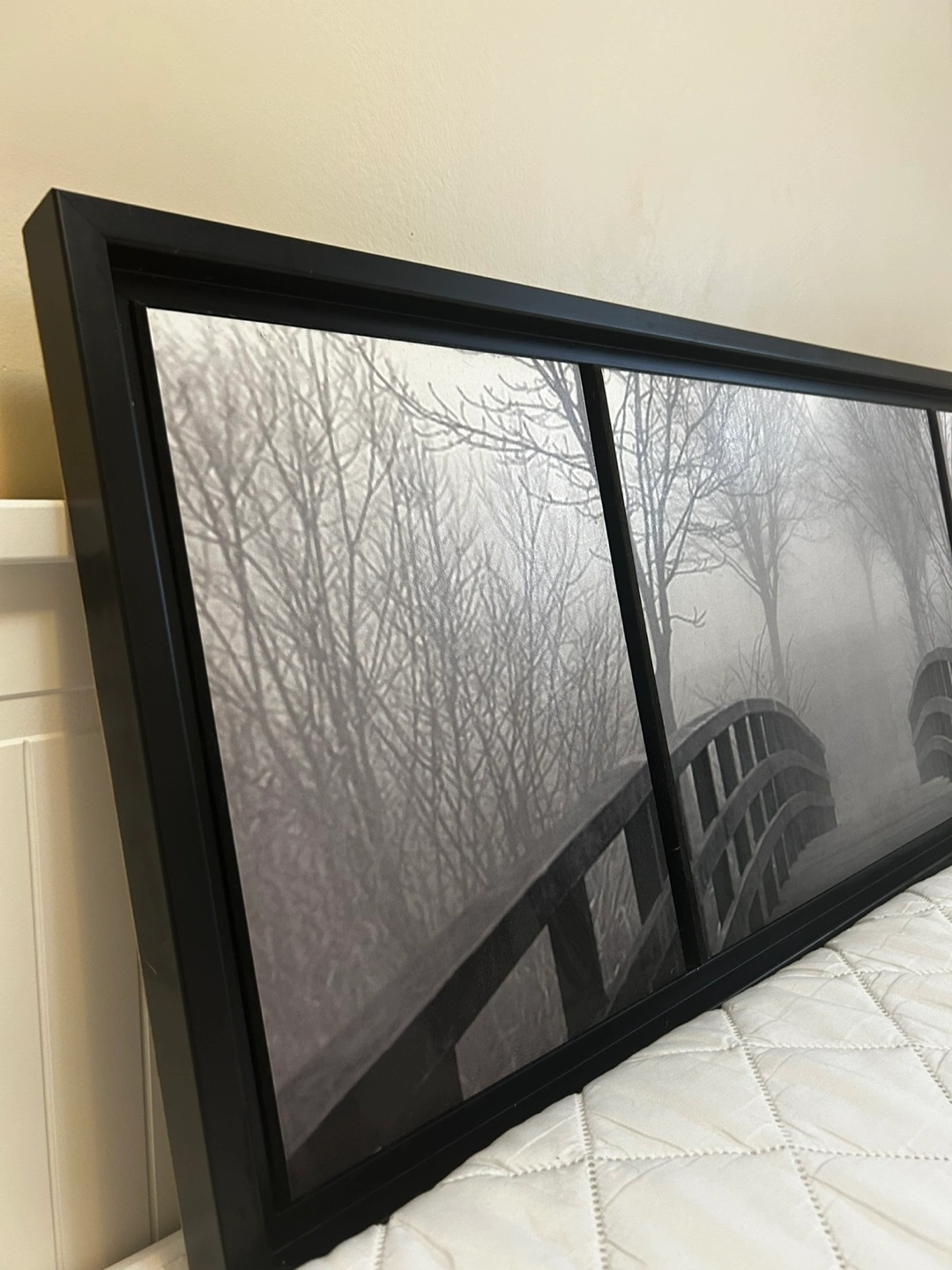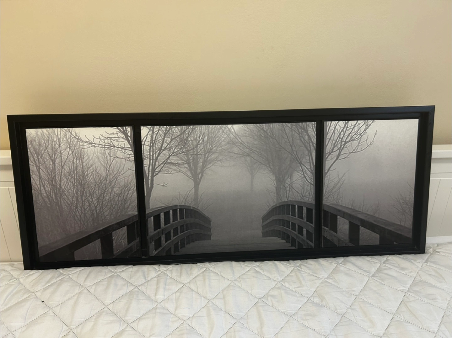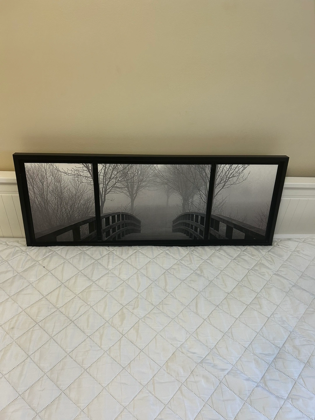 Beautiful black and white triptych wall art. Features a foggy bridge scene. Black frame. Ready to hang. Beautiful condition.